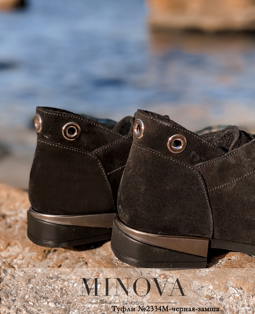 Изящные туфли из натуральной кожи, со шнуровкой на подъёме. Отверстия укреплены широкими люверсами. Такие же отверстия - на заднем ремне. Каблук невысокий, с декоративным металлическим элементом. Подошва с продольным и поперечным рифлением.