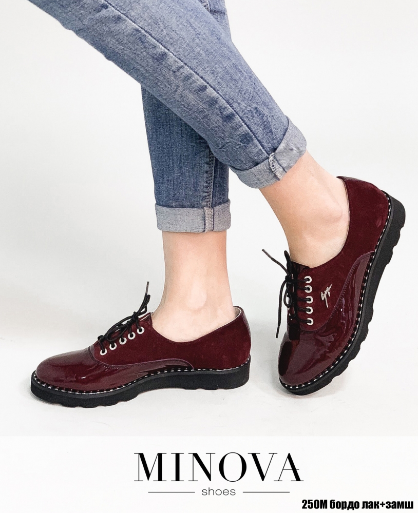 Закрытые туфли на шнурках из лаковой кожи и замши. Туфли на тракторной цельной подошве. Стык подошвы украшен блестящим рантом. Боковинка украшена золотистой металлической деталью.