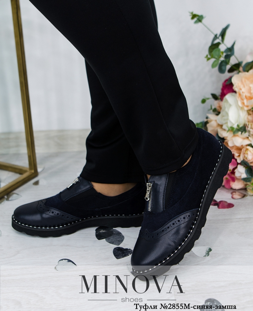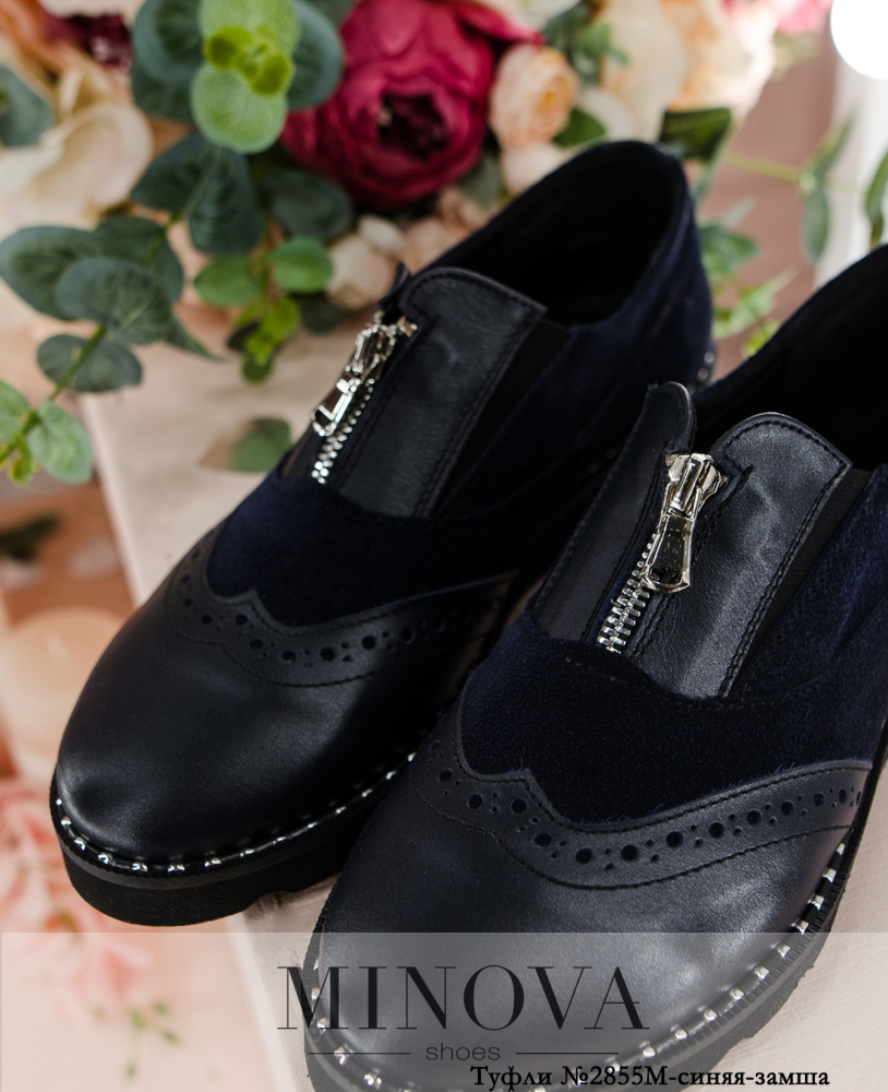 Стильные туфли в "мужском" стиле с брогированным носком. На подъёме - небольшая змейка и вставки резинки по бокам. Подошва волнистая, по ранту украшена металлическими вставками. Туфли выполнены из натуральной мягкой кожи. Высота танкетки впереди: 1.5 см.