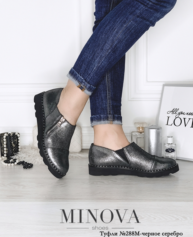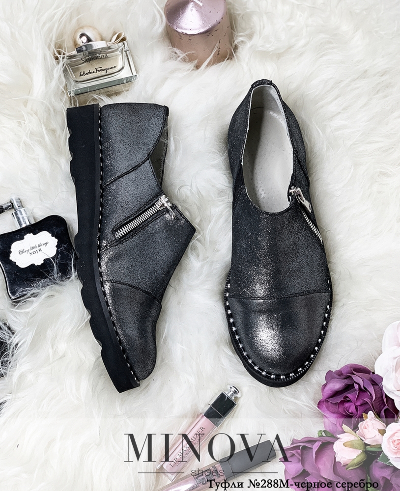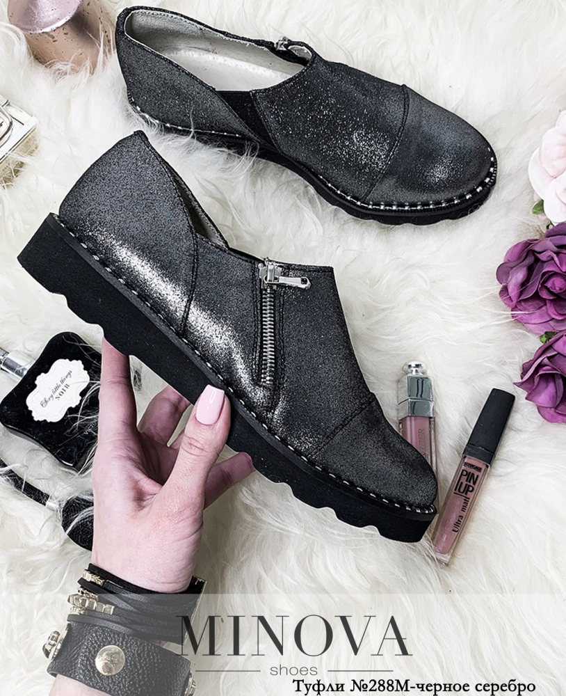 Закрытые кожаные туфли на утолщенной рифленой плоской подошве. В данной модели, прошитые пятка и носок выполнены в основном цвете. Шов подошвы украшен рантом. Внешняя сторона туфель на молнии.