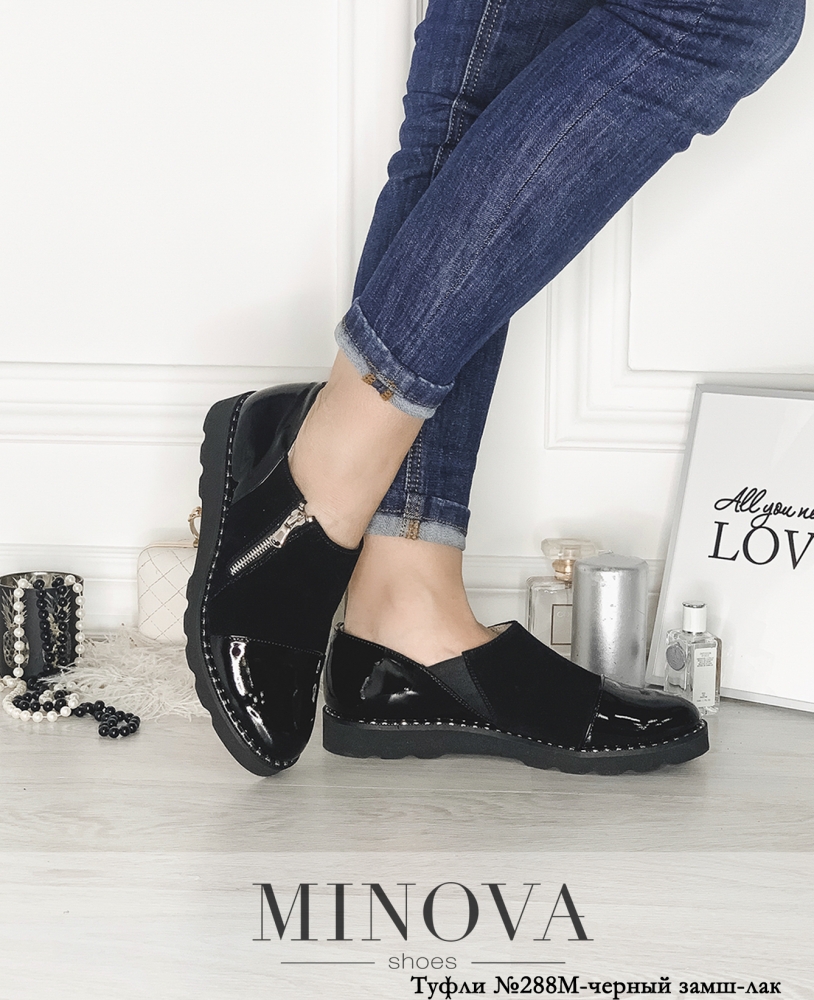 Закрытые замшевые туфли на утолщенной рифленой плоской подошве. В данной модели пятка и носок выполнены в лаковой коже. Шов подошвы украшен рантом. Внешняя сторона туфель на молнии.