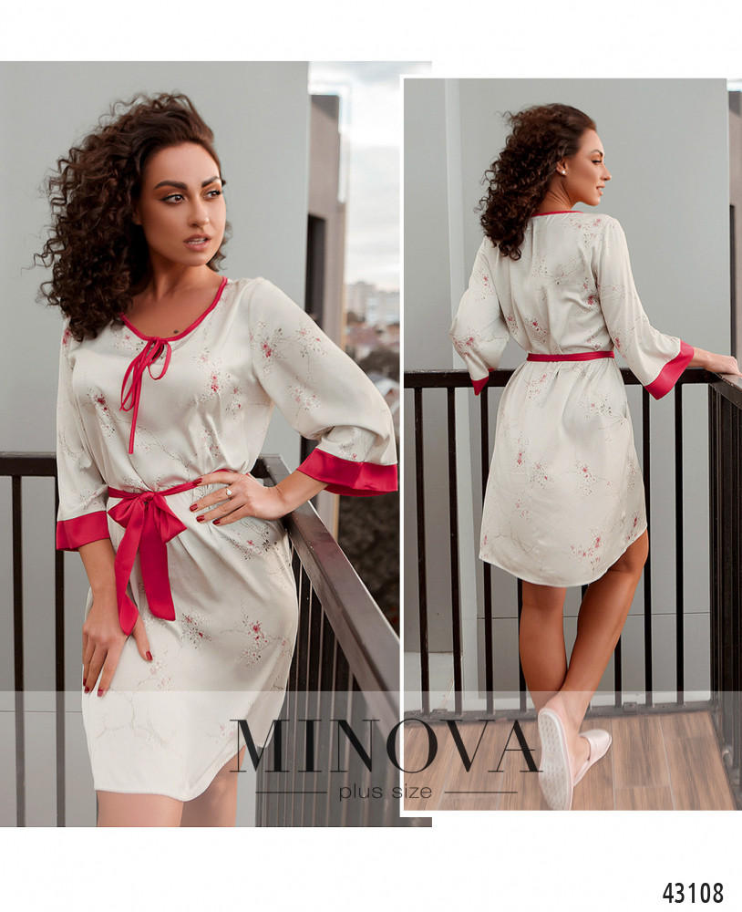 Романтичное платье батал с полукруглым вырезом горловины и лентами под вырезом. Рукава фасона "кимоно", с манжетами. В наличии врезные карманы, застёжек нет. В комплекте пояс.