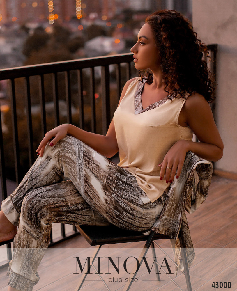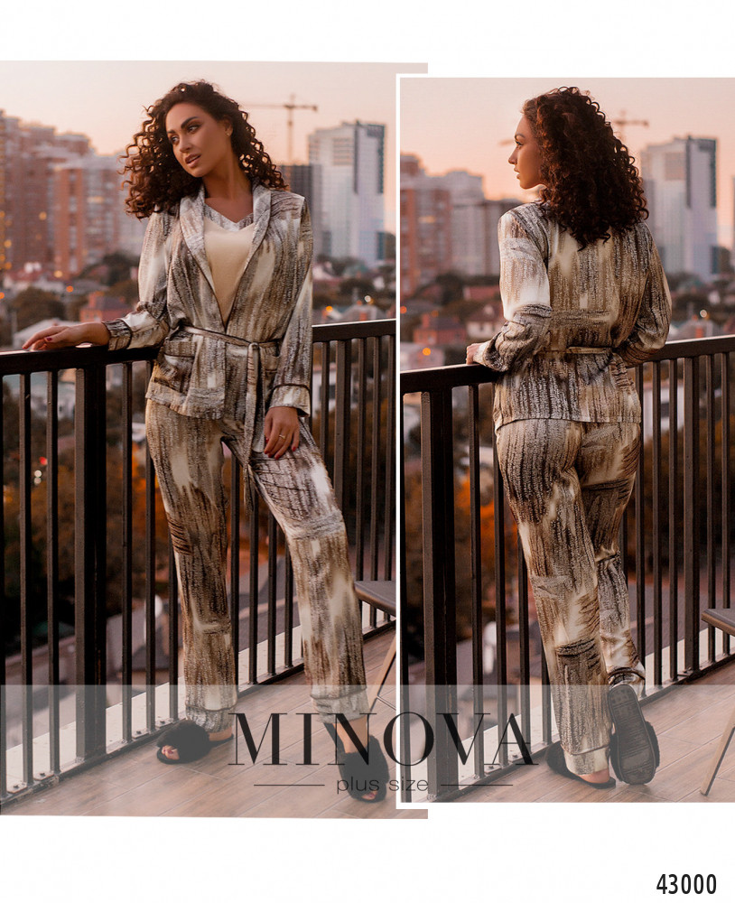 Стильный пижамный костюм-тройка плюс сайз. Жакет с контрастной окантовкой, без застёжек, по бокам - накладные карманы, без подкладки. В комплекте пояс. Брюки с высокой талией, врезными карманами и вшитой в пояс резинкой. Майка с широкими лямками, вырез горловины V-образный, с контрастной окантовкой в тон костюму, без застёжек и карманов.