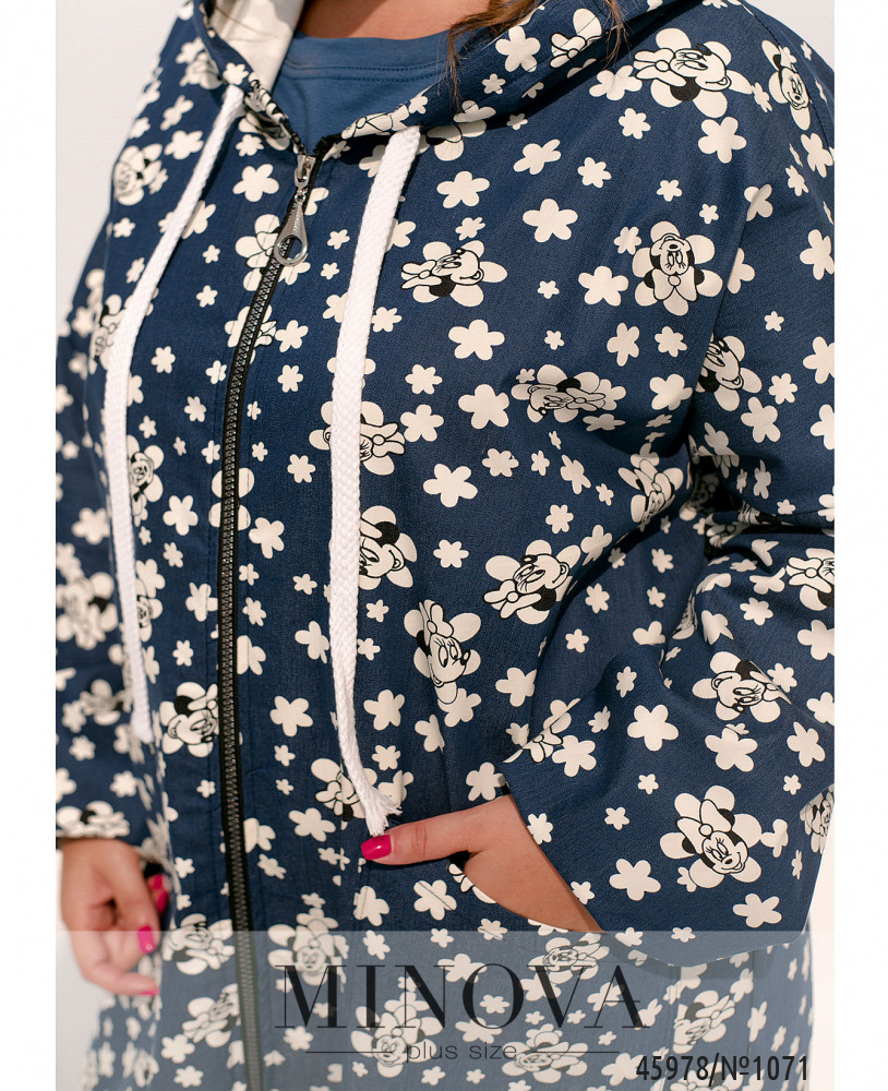 Яркая джинсовая куртка прямого силуэта порадует поклонниц практичной одежды на каждый день. Модель дополнена капюшоном, длинными рукавами с приспущенной линией плеч и накладными карманами по бокам, а ее изюминкой является веселый игривый принт и ассиметричный низ, удлиненный по спинке.