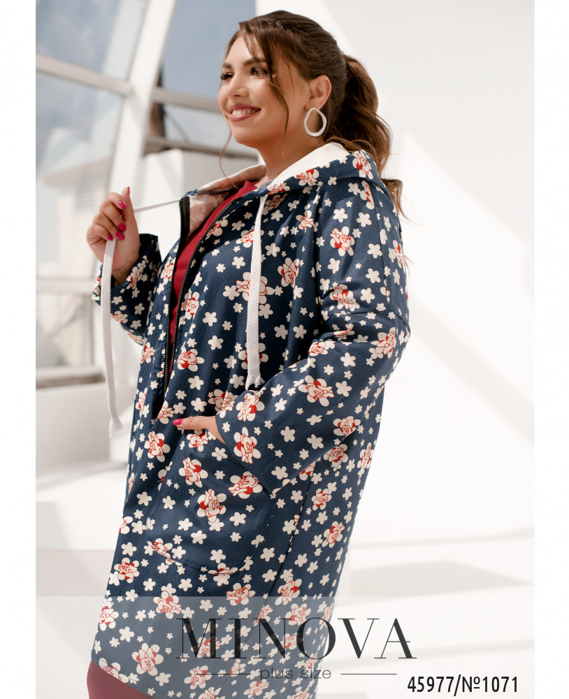 Яркая джинсовая куртка прямого силуэта порадует поклонниц практичной одежды на каждый день. Модель дополнена капюшоном, длинными рукавами с приспущенной линией плеч и накладными карманами по бокам, а ее изюминкой является веселый игривый принт и ассиметричный низ, удлиненный по спинке.
