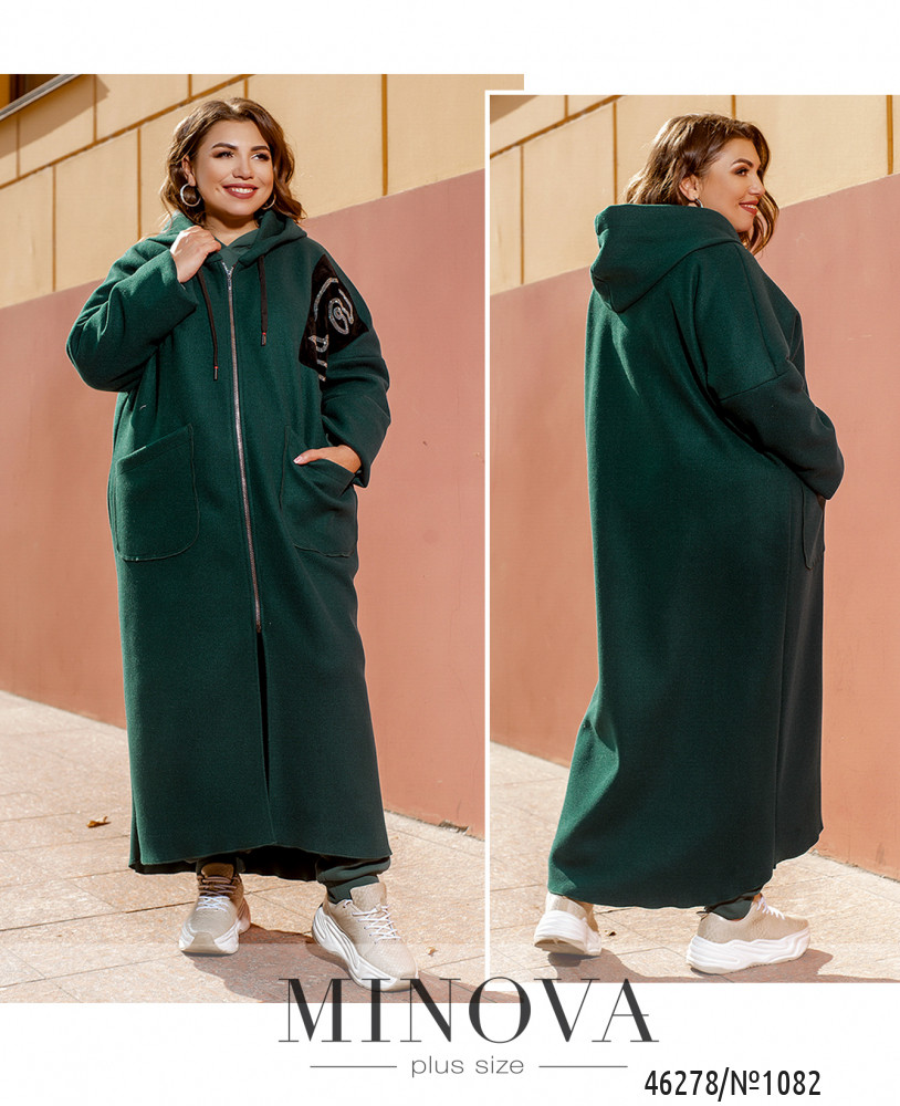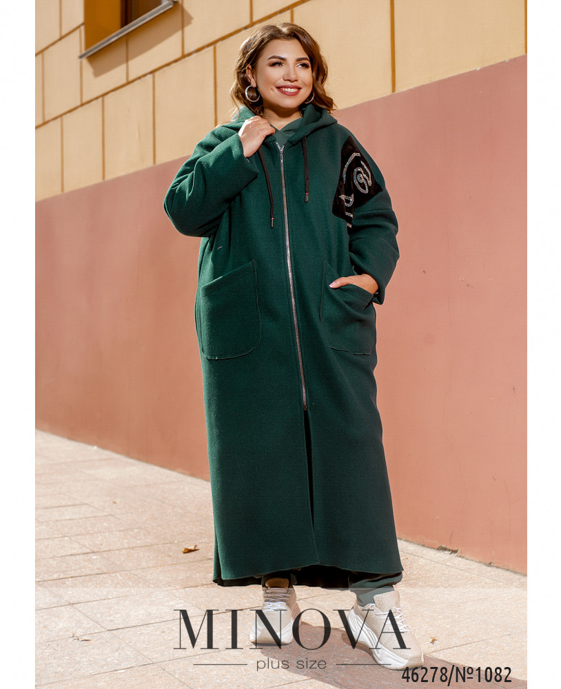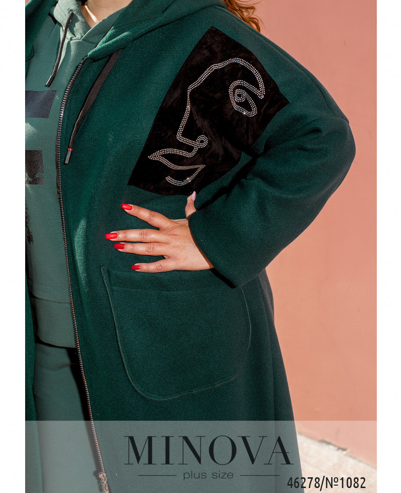 Уютный и удобный кардиган батал с капюшоном, накладными карманами по бокам и молнией по центру. На левой стороне груди – бархатная нашивка, украшенная узором из пайеток. Через капюшон пропущен шнурок. Кофта без подкладки, рукава без манжет.