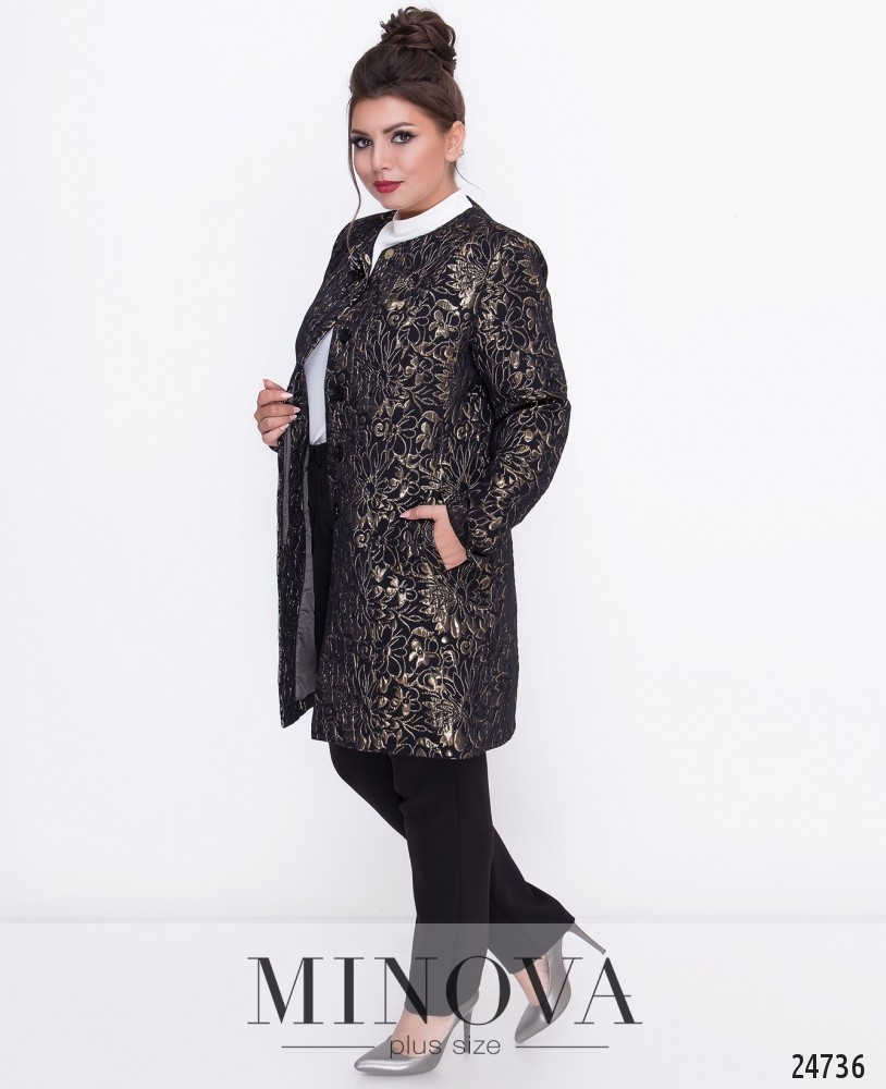 Легкий кардиган из жаккарда на подкладке. Кардиган с карманами, прямого кроя с четкой линией плеча благодаря подплечникам. Круглую горловину украшает крупная брошь-кнопка. Кардиган застегивается на пуговицы, скрытые в планке. Длинные рукава подворачиваются в манжеты с разрезами, что придает образу шика.