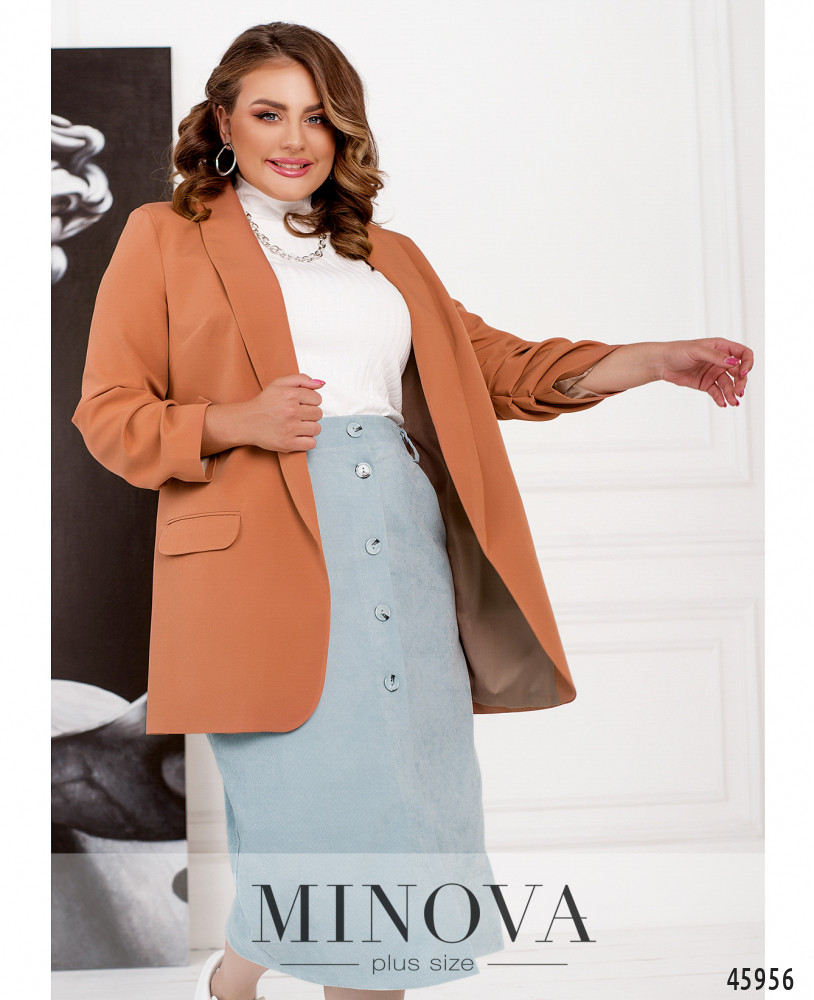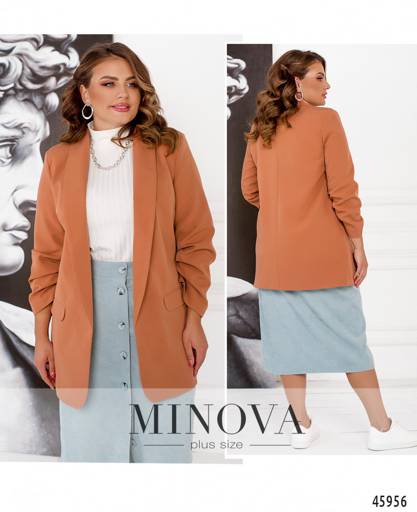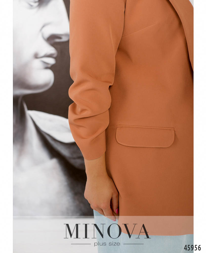 Элегантный минималистичный пиджак плюс сайз с подкладкой, с подплечниками, без застёжек. Лацканы гладкие, рукава со стильными присобранными оборками на месте манжет. Спереди - прорезные карманы.