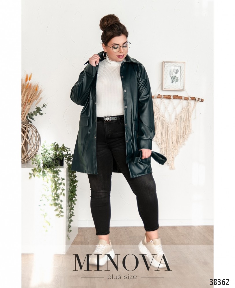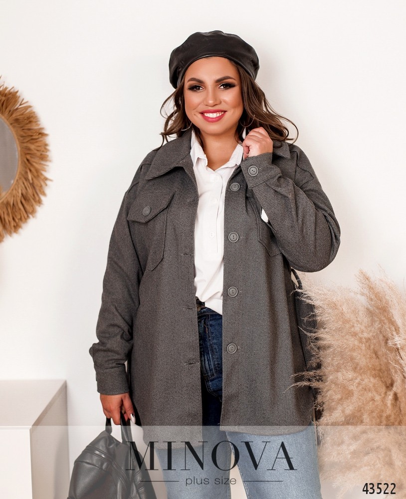 Необычный пиджак плюс сайз в стиле casual с поясом, по бокам – накладные карманы, воротничок отложной, застёгивается на ряд кнопок спереди на планке. Рукава с мягкими манжетами без пуговиц. Есть подклад.