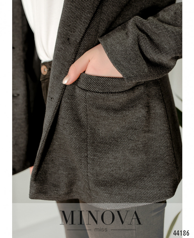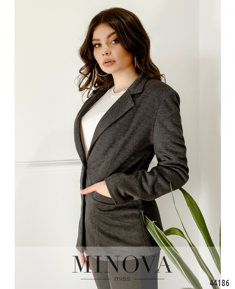 Стильный однобортный пиджак с двумя пуговицами, спереди прорезные карманы без клапанов. Пиджак с резными лацканами, изнутри подкладка, в том числе и на рукавах. В наличии подплечники. На рукавах пуговиц нет.