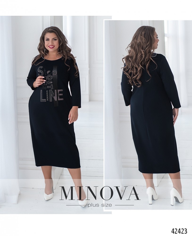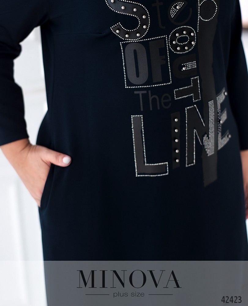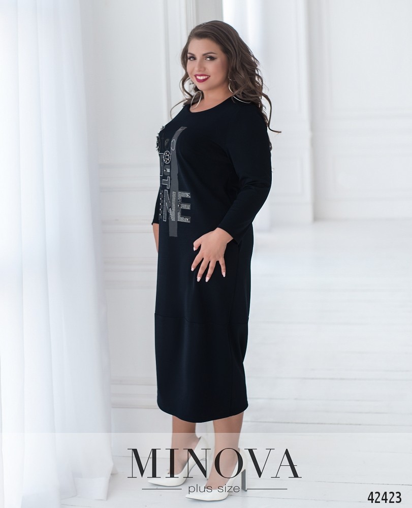 Стильное платье батал с ярким принтом и декором на груди. Подол с подшитой нижней частью. На груди вытачки. Рукава без манжет. По бокам - врезные карманы. Без застёжек.