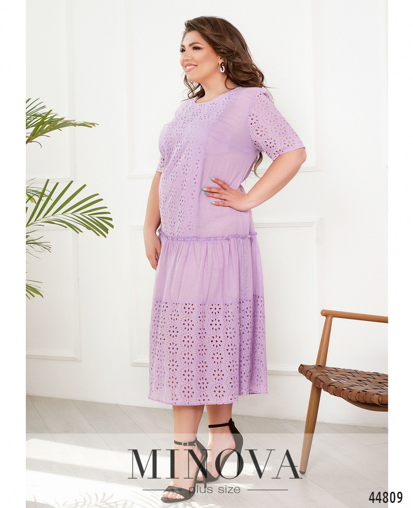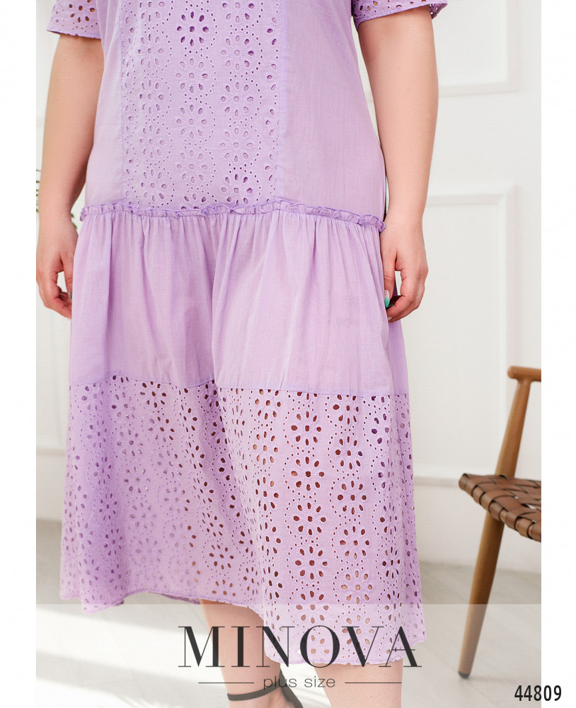 Нежное платье батал с ажурными вставками с перфорацией без подкладки. Вырез горловины полукруглый. Подол также украшен оборками и ажурным декором. На груди вытачки, застёжек и карманов нет. На спинке и на груди - продольные вставки с прошвой.