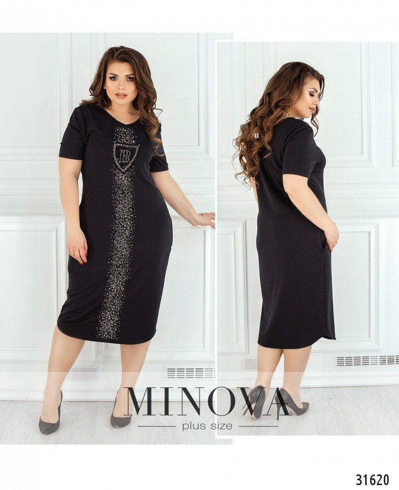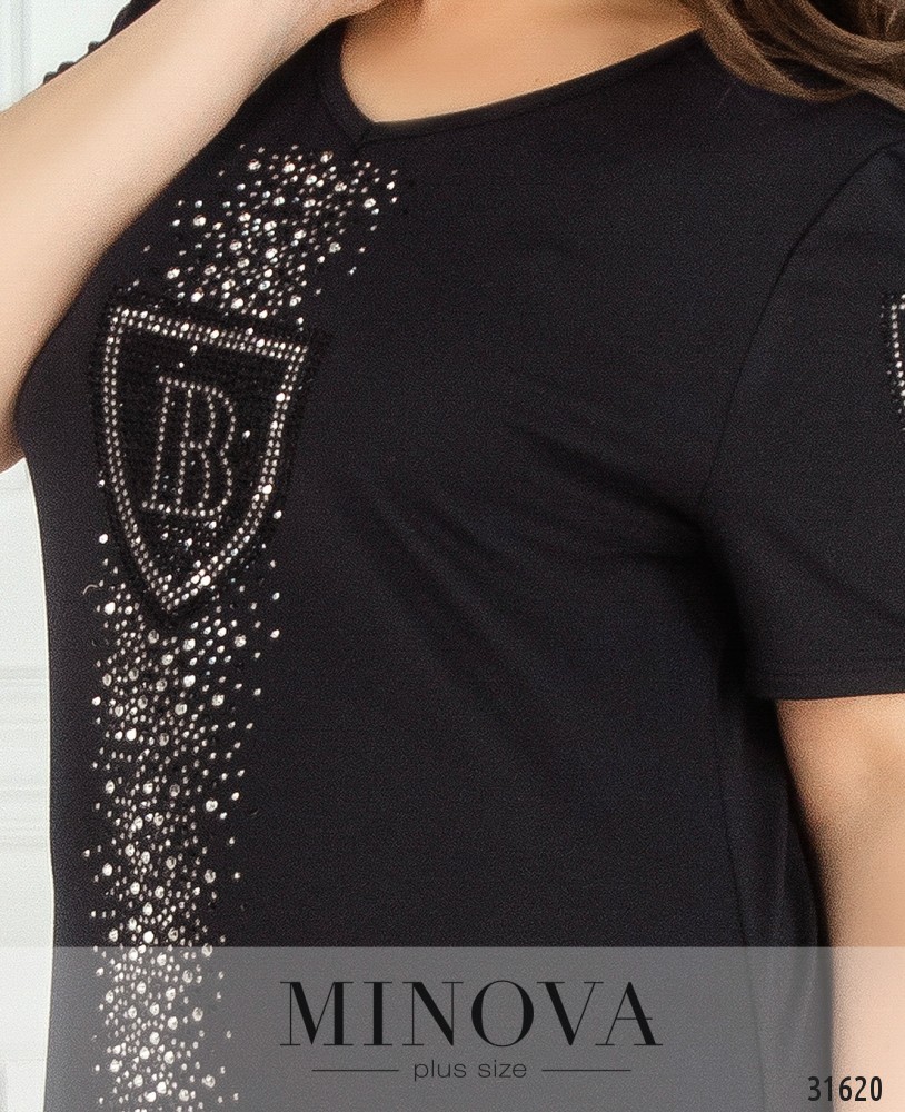 Платье-футболка с декоративной блестящей планкой. Платье прямого кроя с короткими рукавами и закругленным подолом. Лицевая сторона и рукава украшены блестящей россыпью. Платье дополнено скрытыми карманами.