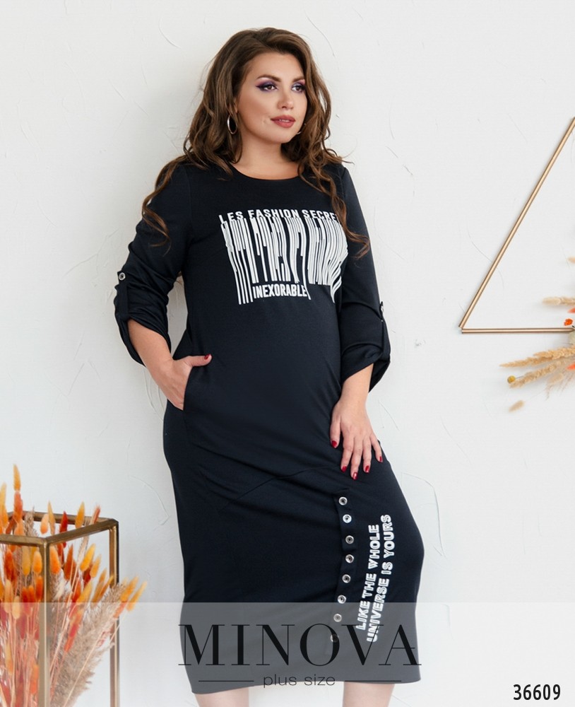 Оригинальное платье батал от Minova выполнено из очень приятной гладкой ткани. Платье приталенное, без застёжек, с полукруглым вырезом горловины. По бокам – врезные карманы, на груди – небольшие вытачки. Нарядности платью придают яркий принт на груди и на подоле, а также ряд диагонально расположенных декоративных кнопок на подоле. Подол с поперечным швом. Рукава полной длины, без манжет, регулируются на пуговку-кнопку и ленту, причём на ленте два отверстия для пуговицы. Платье отлично впишется в ваш повседневный гардероб.