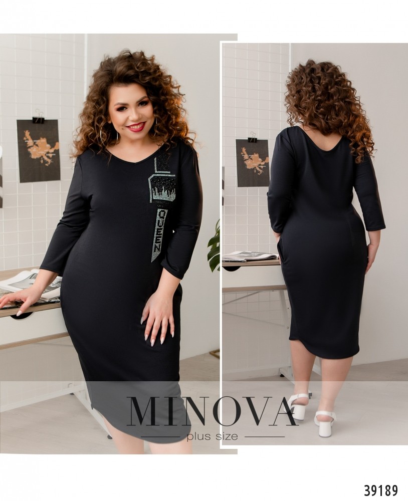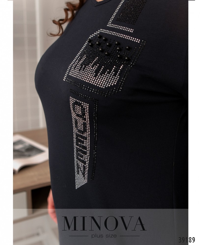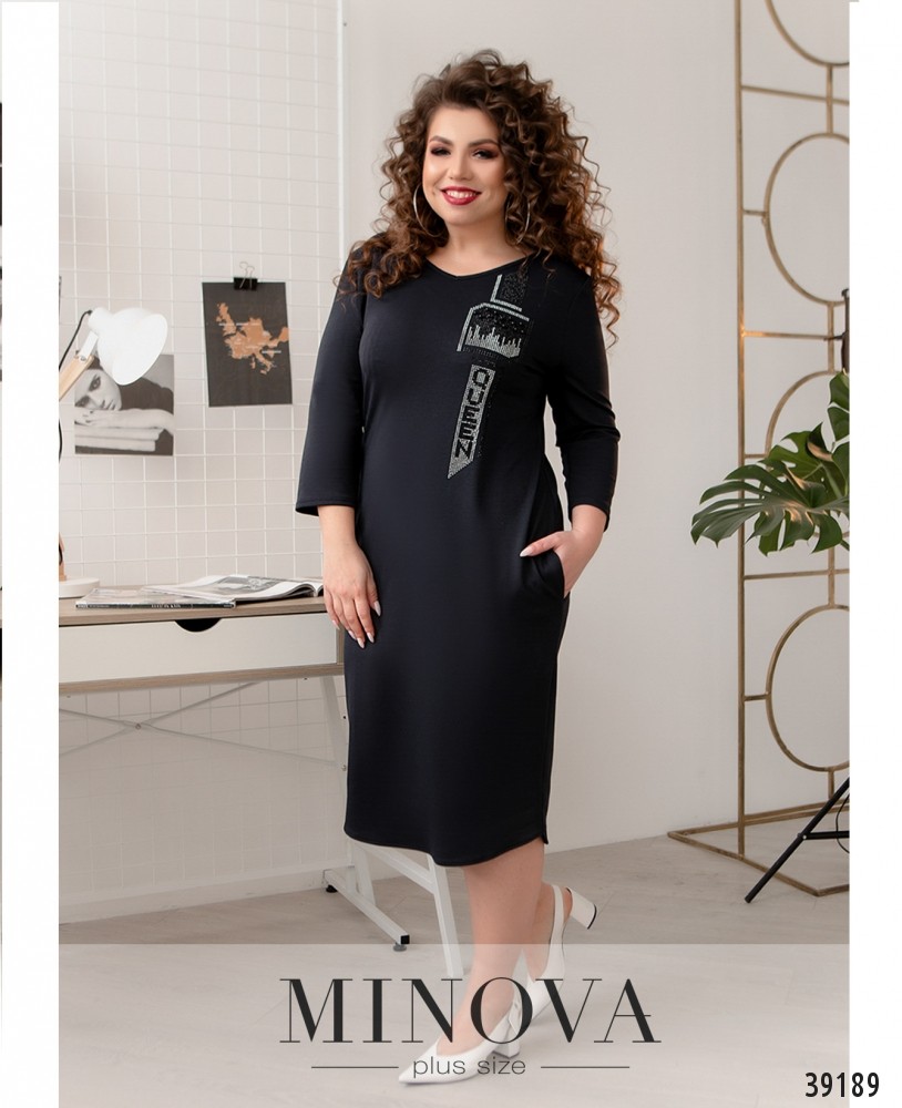 Стильное повседневное платье плюс сайз с ярким декором из страз и бусин на груди. Вырез горловины V-образный, широкий. Рукава без манжет, по бокам - врезные карманы. Застёжек нет.