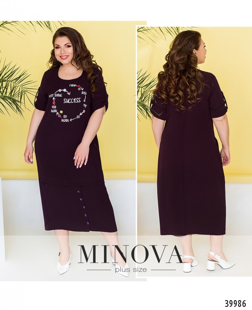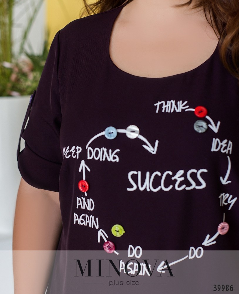 Актуальное платье плюс сайз с оригинальным принтом и декоративными пуговицами на груди и на подоле. Рукава-трансформеры регулируются на пуговицу и ленту, на ленте две прорези для пуговицы. По бокам - врезные карманы, на груди вытачки. Застёжек нет, вырез горловины полукруглый.