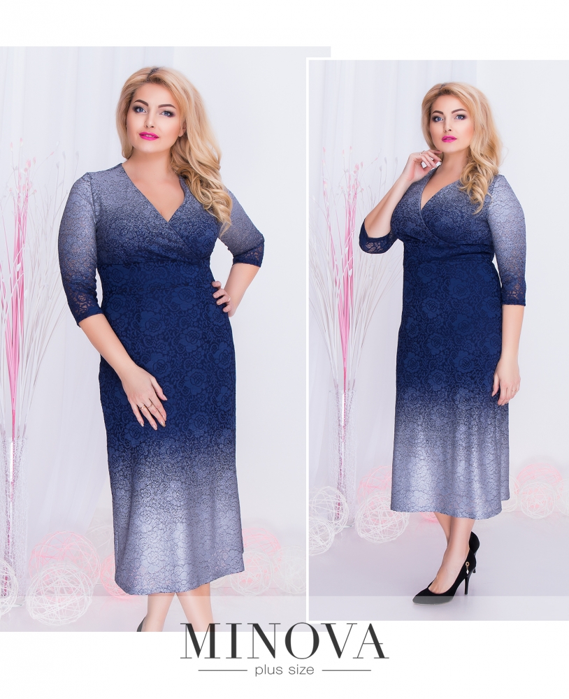 Прямое кружевное платье-миди с V-образным вырезом на запах и рукавом ¾. Платье изготовлено из плотной кружевной эластичной ткани с отливом и цветовым градиентом