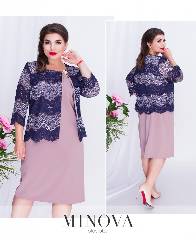 Прямое платье с кружевным жакетом с брошью и рукавом 3/4. Элегантный полупрозрачный фальш-жакет с круглой горловиной, длиной до линии бедра. Длина изделия закрывает колени. Небольшой разрез сзади не сковывает движения.