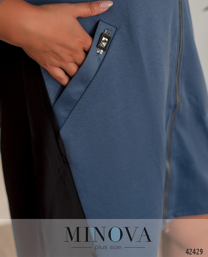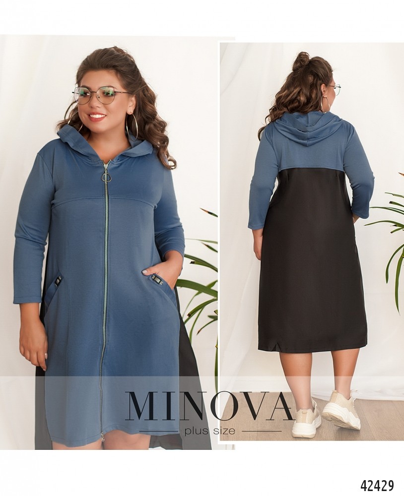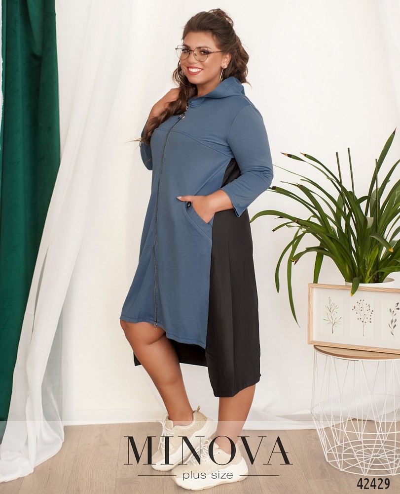 Длинное платье батал с капюшоном и молнией по центру, застёгивается на два бегунка: круглый сверху и стандартный снизу. По бокам - врезные карманы с декоративными пряжками. Подол асимметричный, по спинке длиннее. Без подкладки. Рукава без манжет.