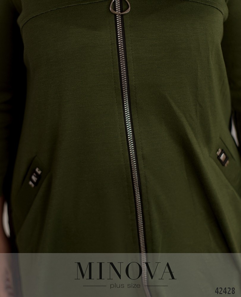 Длинное платье батал с капюшоном и молнией по центру, застёгивается на два бегунка: круглый сверху и стандартный снизу. По бокам - врезные карманы с декоративными пряжками. Подол асимметричный, по спинке длиннее. Без подкладки. Рукава без манжет.
