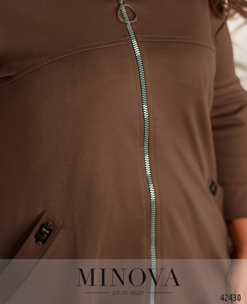 Длинное платье батал с капюшоном и молнией по центру, застёгивается на два бегунка: круглый сверху и стандартный снизу. По бокам - врезные карманы с декоративными пряжками. Подол асимметричный, по спинке длиннее. Без подкладки. Рукава без манжет.