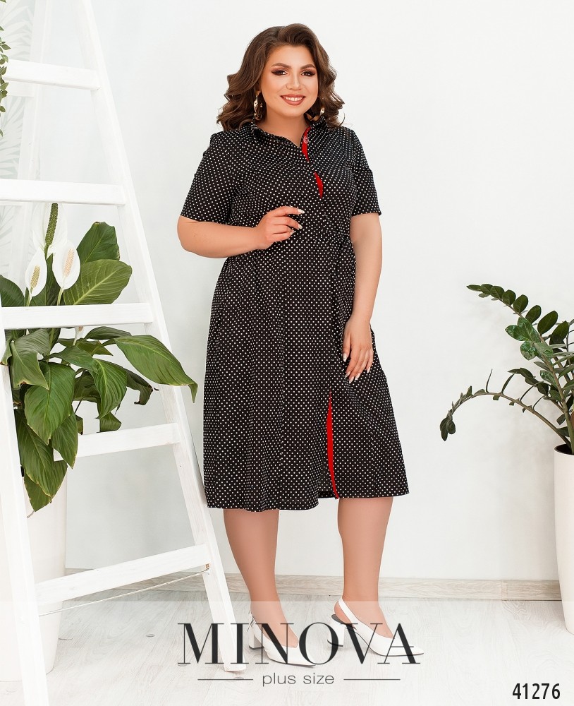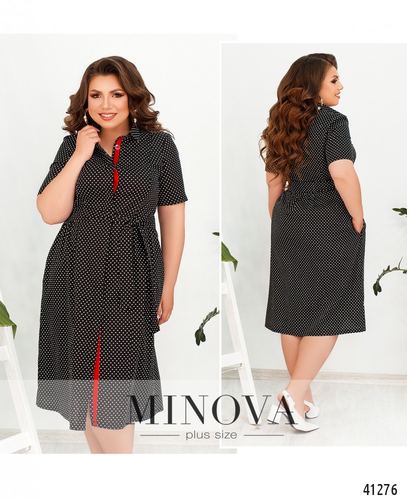 Изящное платье батал в мелкий горох, в комплекте - пояс. Застёгивается на пуговицы спереди от отложного воротничка до низа. Пуговицы прикрываются верхней планкой. По бокам - врезные карманы. Подол присобран мягкими оборками от боков и по спинке. Рукава без манжет.