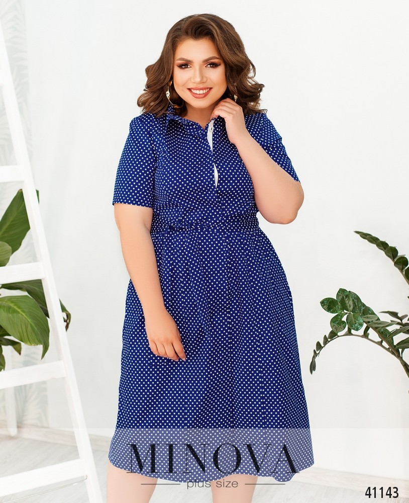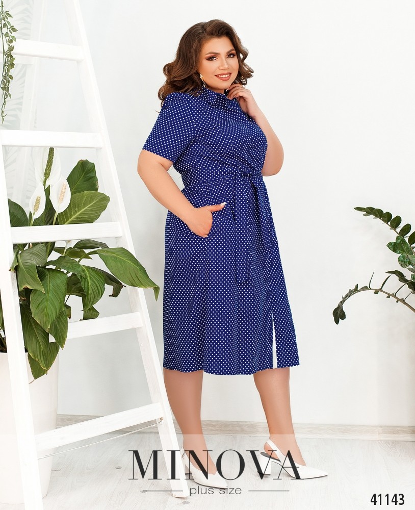 Изящное платье батал в мелкий горох, в комплекте - пояс. Застёгивается на пуговицы спереди от отложного воротничка до низа. Пуговицы прикрываются верхней планкой. По бокам - врезные карманы. Подол присобран мягкими оборками от боков и по спинке. Рукава без манжет.