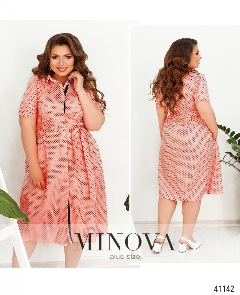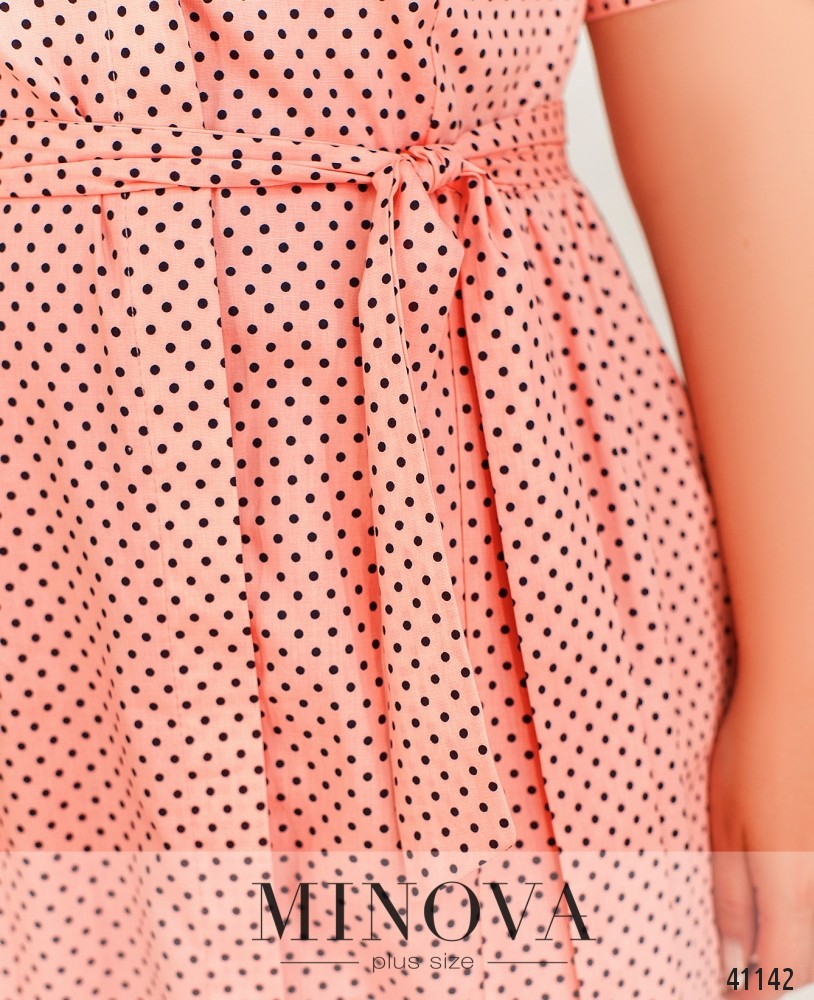 Изящное платье батал в мелкий горох, в комплекте - пояс. Застёгивается на пуговицы спереди от отложного воротничка до низа. Пуговицы прикрываются верхней планкой. По бокам - врезные карманы. Подол присобран мягкими оборками от боков и по спинке. Рукава без манжет.