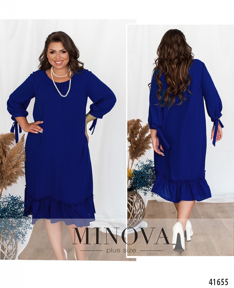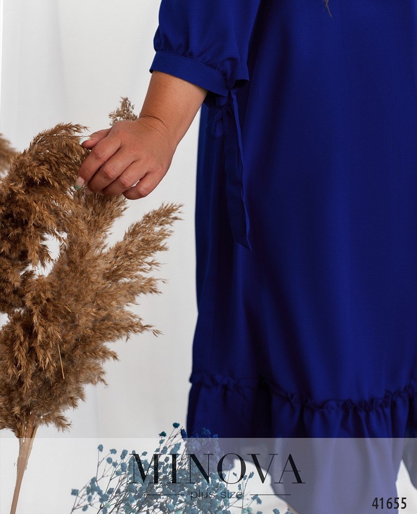 Очаровательное платье батал с оборками на подоле, вырез горловины полукруглый, ткань под ним присобрана, платье с приталенным силуэтом. Рукава с манжетами, на манжетах завязываются ленты. Снизу под верхним слоем - мягкая подкладочная ткань. Без застёжек и карманов.