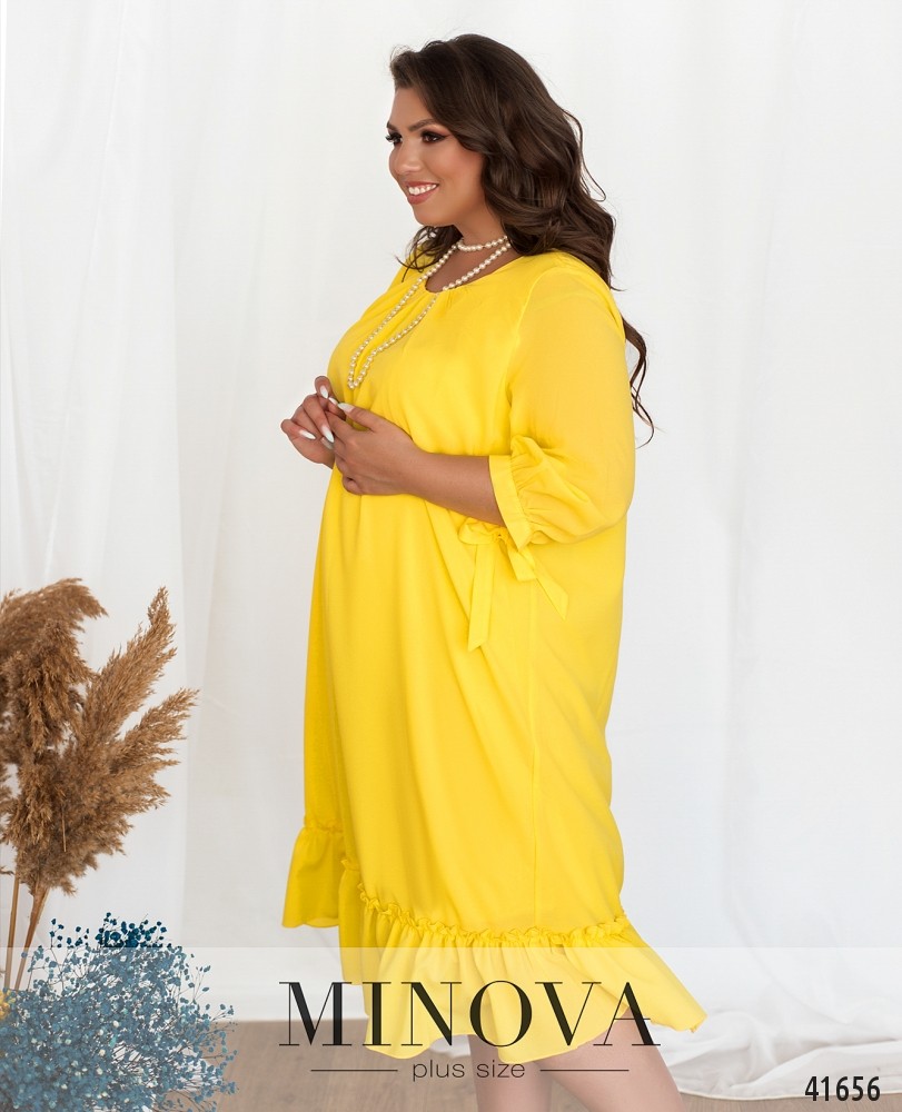 Очаровательное платье батал с оборками на подоле, вырез горловины полукруглый, ткань под ним присобрана, платье с приталенным силуэтом. Рукава с манжетами, на манжетах завязываются ленты. Снизу под верхним слоем - мягкая подкладочная ткань. Без застёжек и карманов.