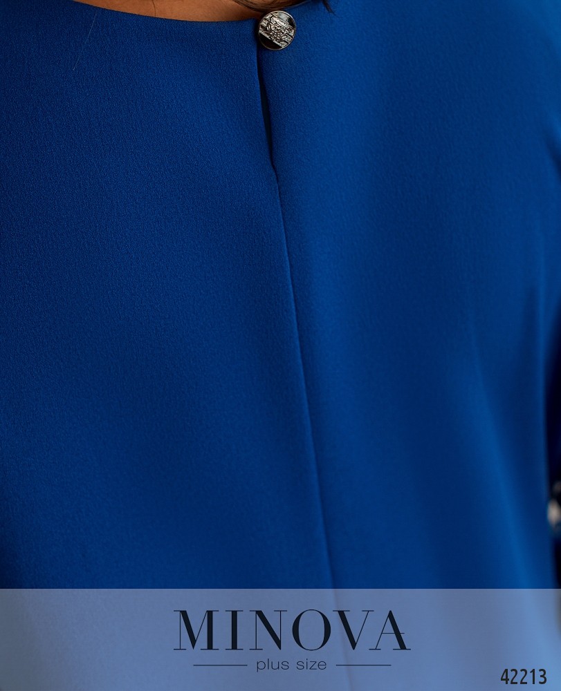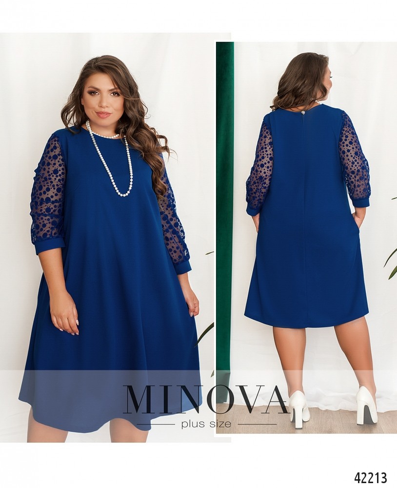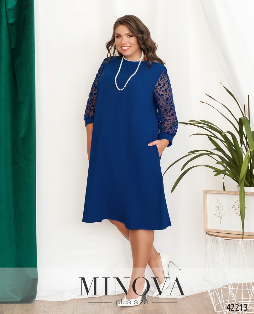 Нарядное платье батал с бусами. Платье застёгивается на пуговку сзади под шеей, по бокам - врезные карманы. На груди вытачки. Рукава полупрозрачные, с плотными манжетами. Вырез горловины полукруглый. Украшение входит в комплект.
