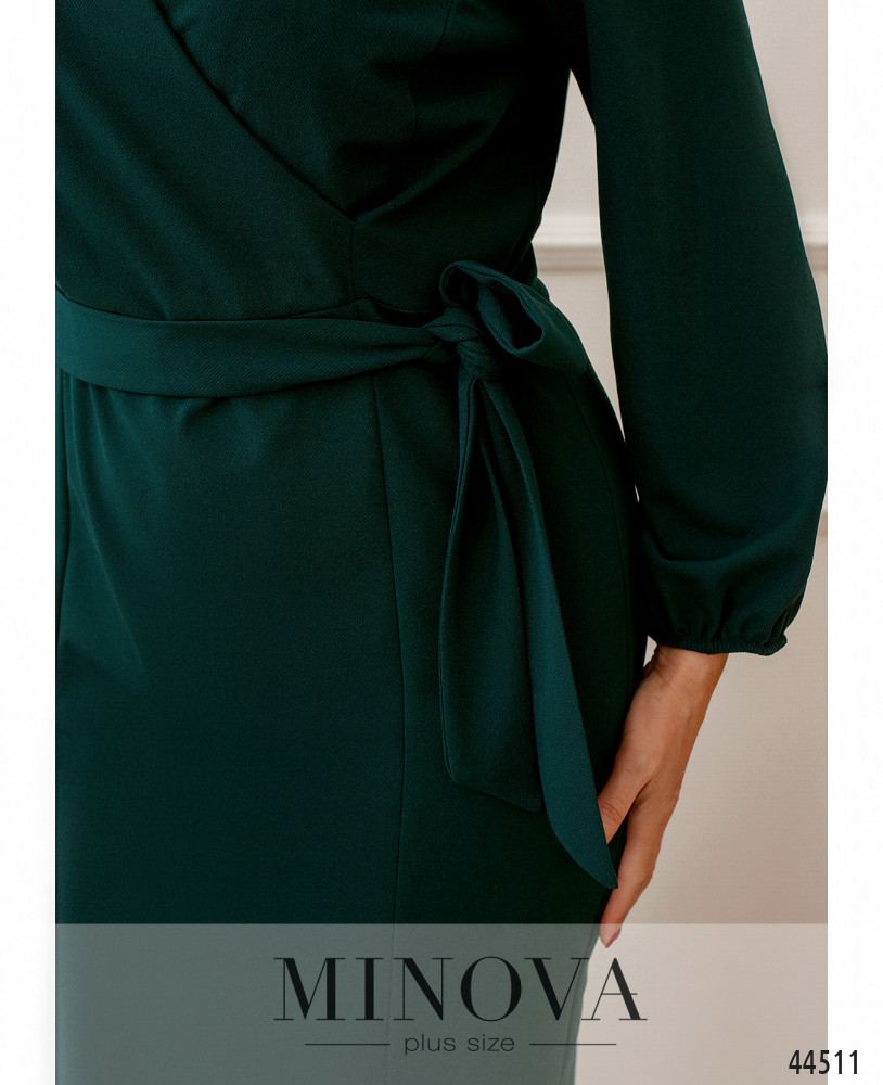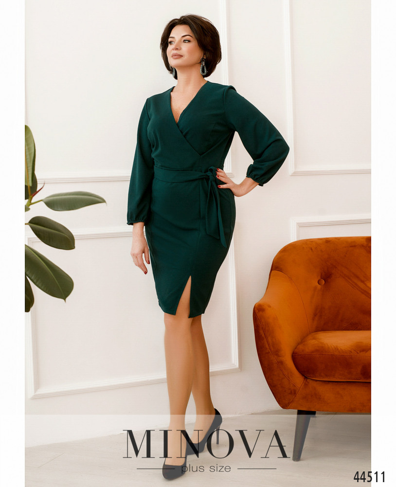 Нежное платье батал с подшитым на запАх лифом, рукава широкие, на манжетах сужены и подшиты на резинки. Застёжка - вшитая по спинке молния. На груди длинные вытачки. Спереди сбоку на подоле небольшая шлица. Карманов нет.