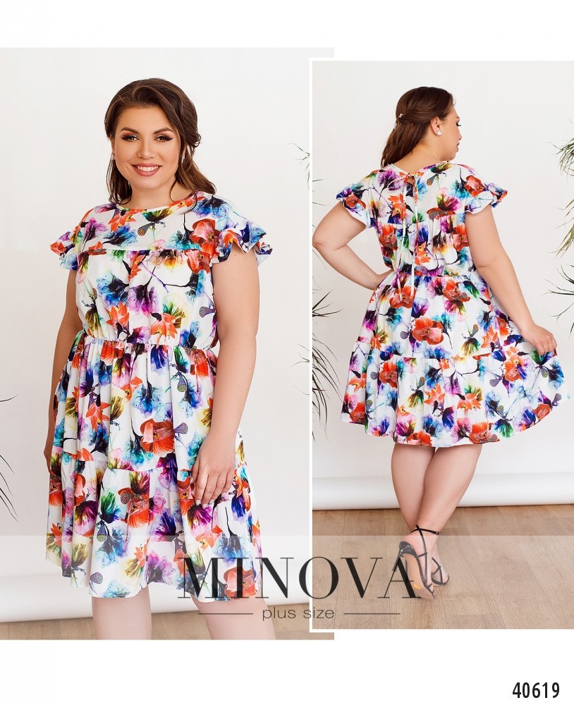 Яркое, нарядное и женственное платье батал с цветочным принтом. Рукава-крылышки, короткие, с оборками. Вырез горловины полукруглый. Подол с оборками, подшит к лифу и расклешён. Без застёжек и карманов, сзади под шеей - две ленты-завязки.