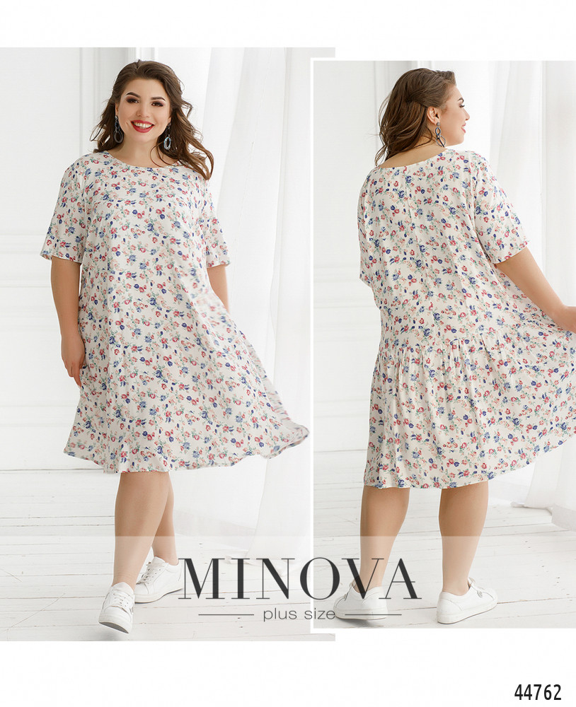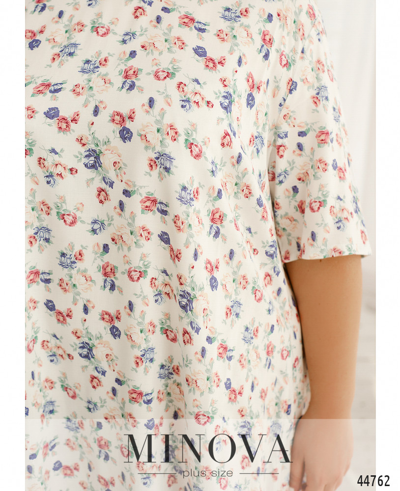Оригинальное платье батал с оборками на подоле, подшитыми сзади. Вырез горловины полукруглый, рукава без манжет, застёжек и карманов нет.