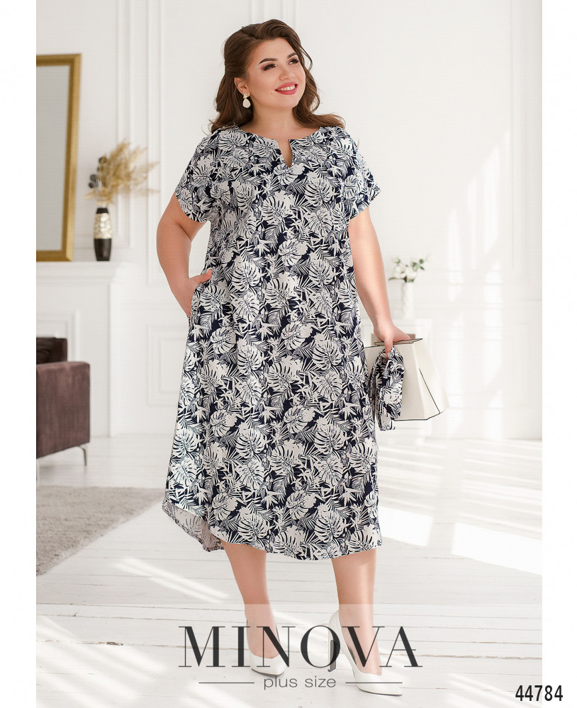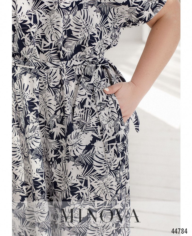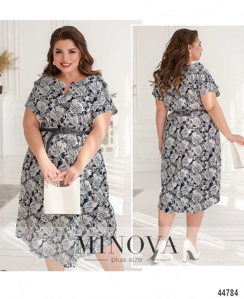 Яркое и нарядное платье батал с принтом, вырез горловины - полукруглый с V-образным углублением. По бокам - карманы в шве, застёжек нет, рукав фасона "летучая мышь". Пояс/аксессуар входит в комплект.