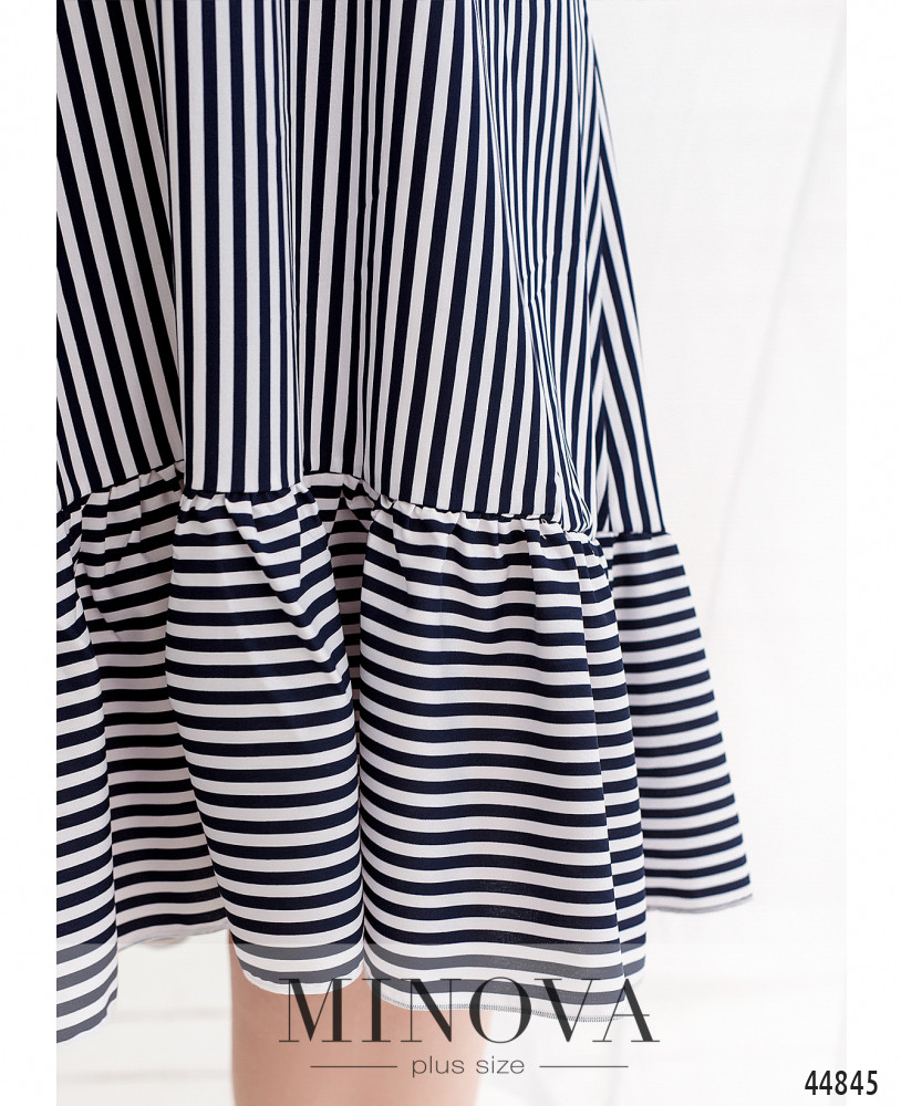 Стильное платье плюс сайз с полукруглым вырезом горловины, застёжка - пуговка сзади под шеей, без рукавов, на груди вытачки, на подоле оборки. Без карманов.