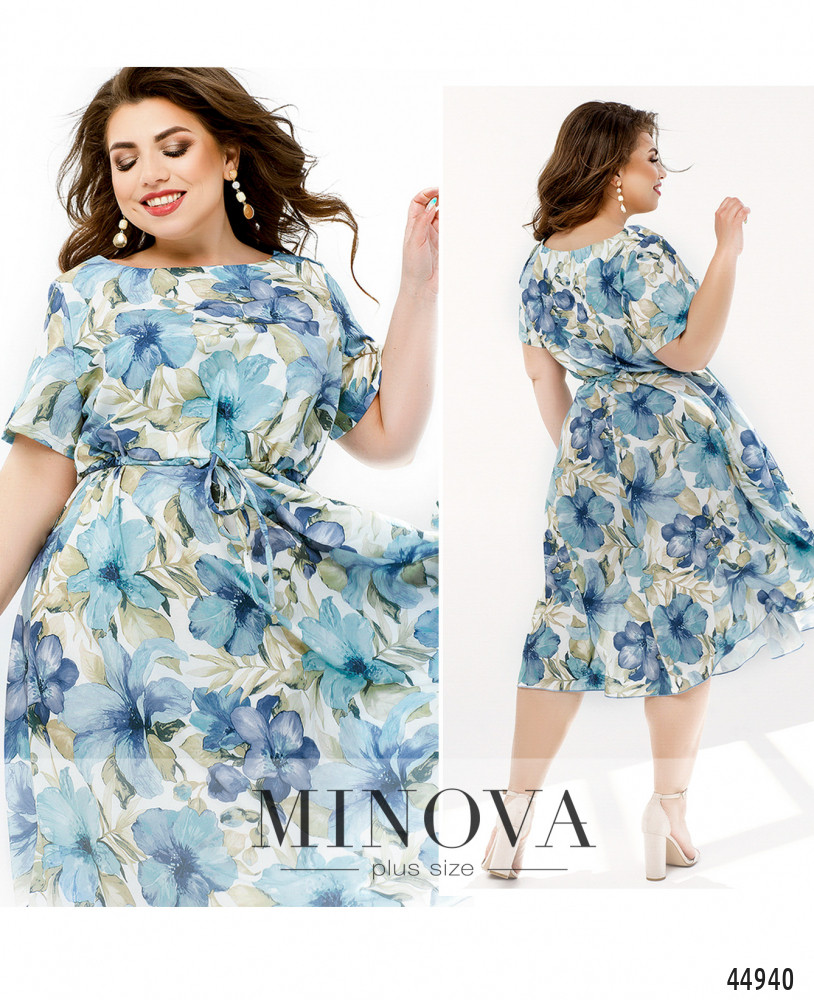 Стильное платье большого размера с коротким рукавом, без застёжек и карманов, с широким полукруглым вырезом горловины. Через талию пропущен шнурок под кулиской, подол ниспадает мягкими оборками.