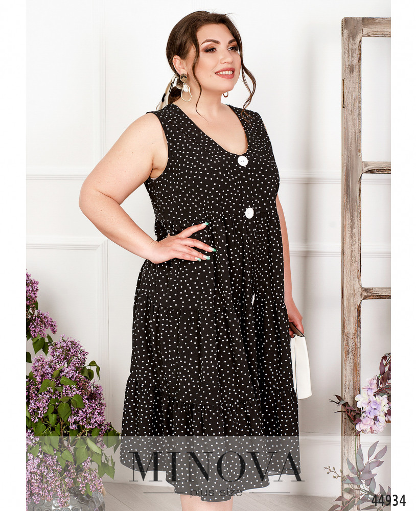 Нежное платье батал с декоративными пуговицами спереди на планке, без рукавов, на широких бретелях. Вырез горловины - смягчённый V-образный. Подол подшит несколькими рядами оборок. Застёжек и карманов нет.