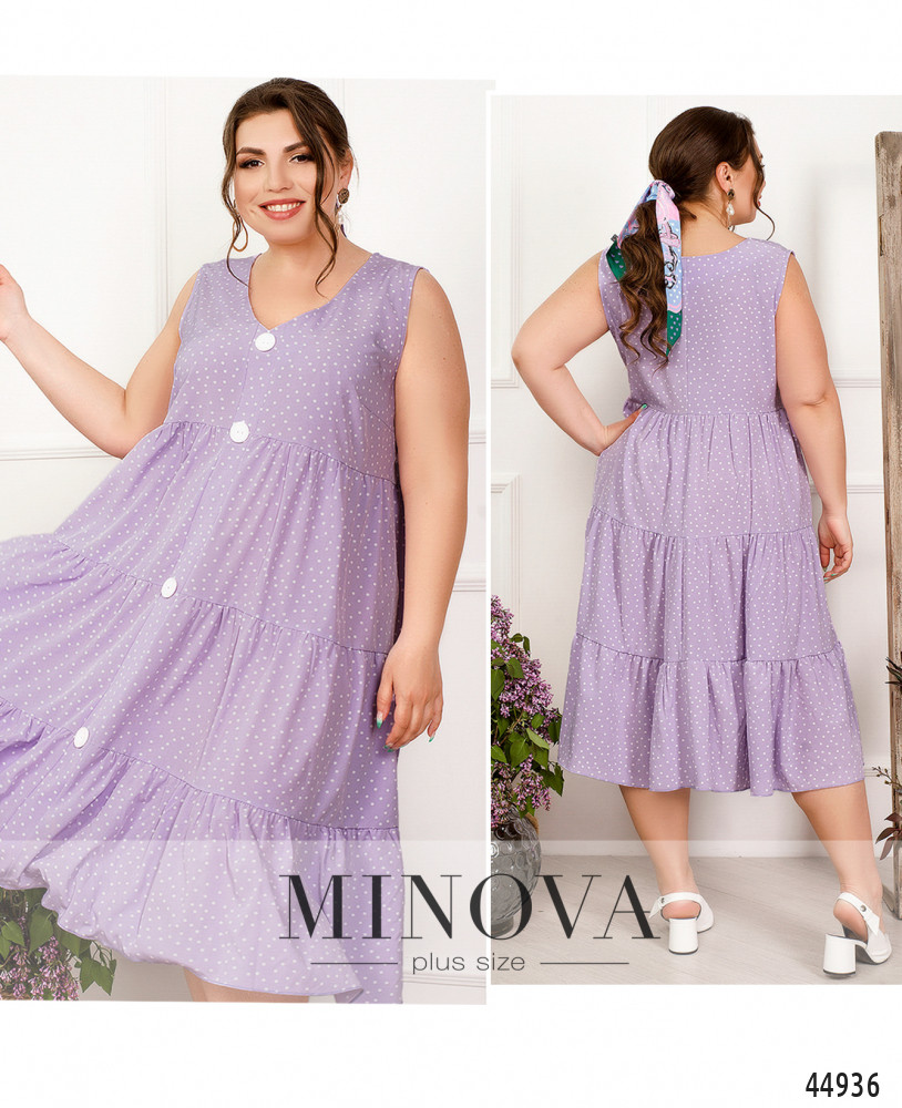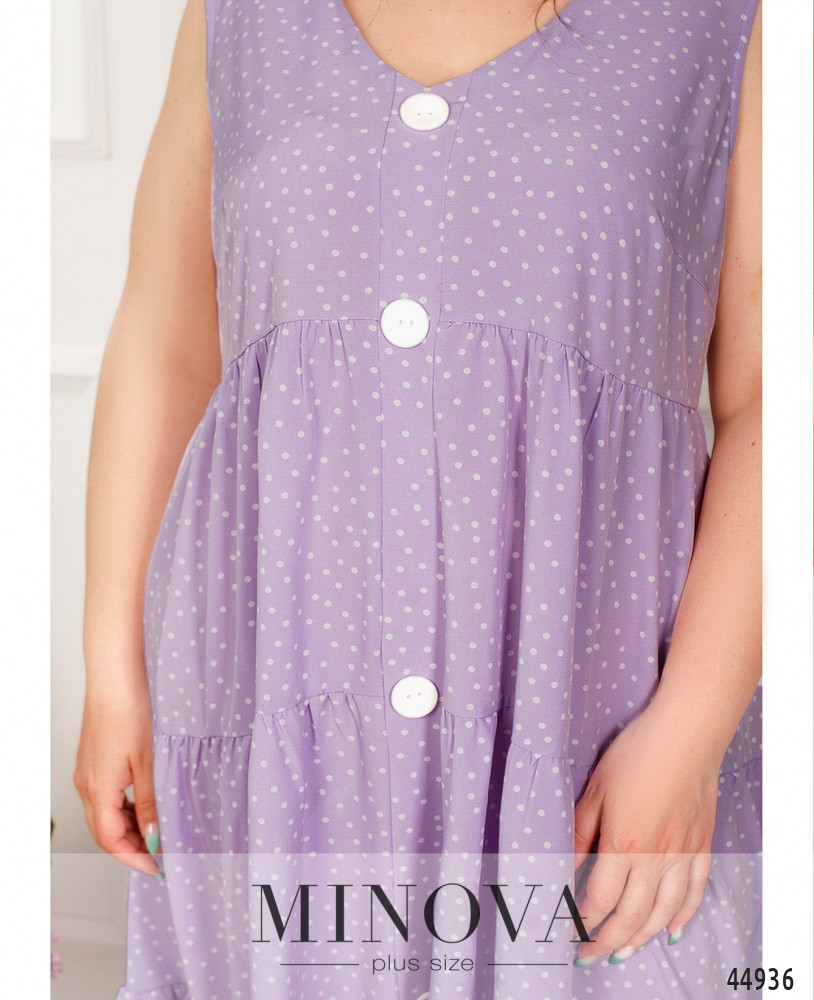 Нежное платье батал с декоративными пуговицами спереди на планке, без рукавов, на широких бретелях. Вырез горловины - смягчённый V-образный. Подол подшит несколькими рядами оборок. Застёжек и карманов нет.