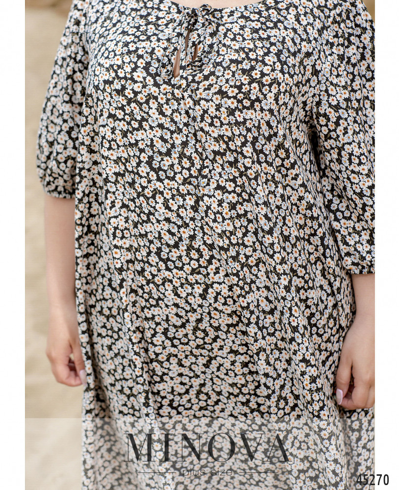 Универсальное женственное платье миди трапециевидного силуэта с цветочным принтом подчеркнёт красоту каждой его обладательницы. Воздушные рукава длиной 3/4 на резинках и полукруглый вырез горловины с декоративными завязками сделают ваш образ изящным и романтичным.