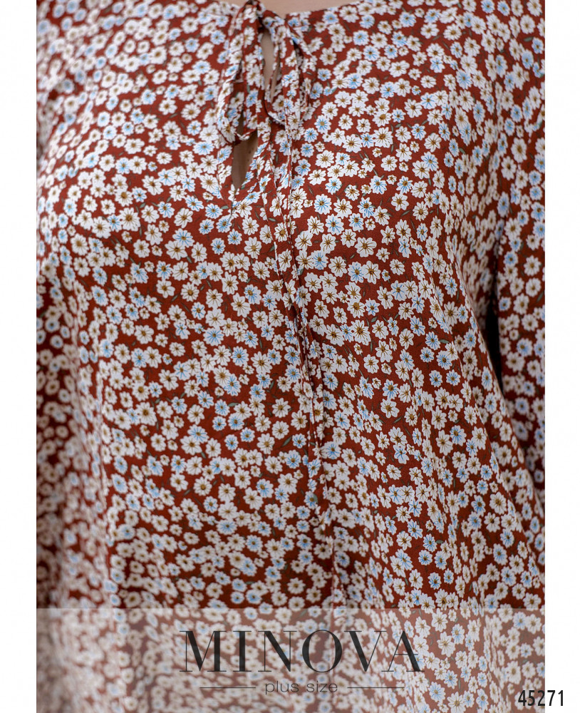 Универсальное женственное платье миди трапециевидного силуэта с цветочным принтом подчеркнёт красоту каждой его обладательницы. Воздушные рукава длиной 3/4 на резинках и полукруглый вырез горловины с декоративными завязками сделают ваш образ изящным и романтичным.