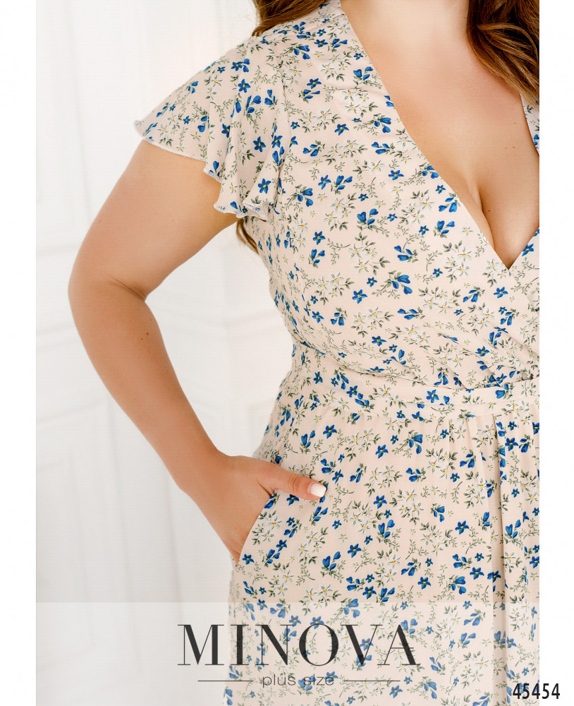 Очаровательное приталенное платье с резинкой, вшитой по линии талии, выполнено из натуральной ткани с контрастным принтом. В этой модели с воздушными рукавами-крылышками, глубоким V-образным декольте, подшитым на запАх, и воланом по краю подола вы сможете создать нежный и чувственный образ на каждый день. Дополните его текстильным поясом в тон, который идет в комплекте