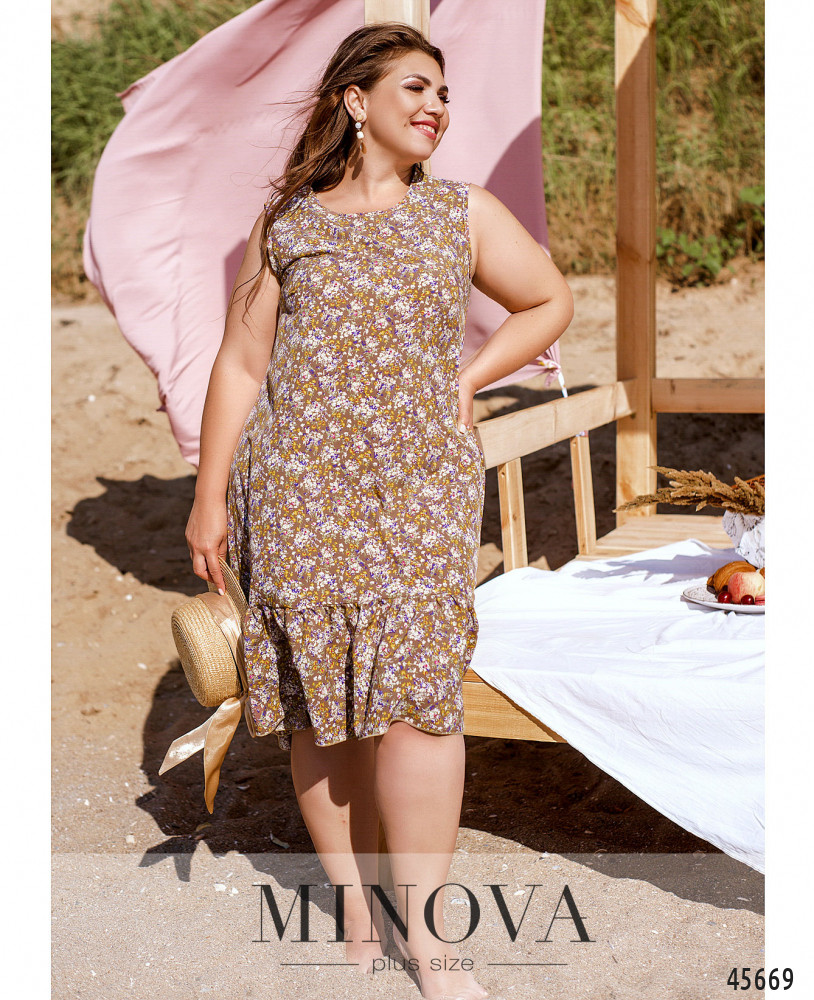 Стильное платье плюс сайз с полукруглым вырезом горловины, застёжка - пуговка сзади под шеей, без рукавов, на груди вытачки, на подоле оборки. Без карманов. Пояс НЕ входит в комплект.