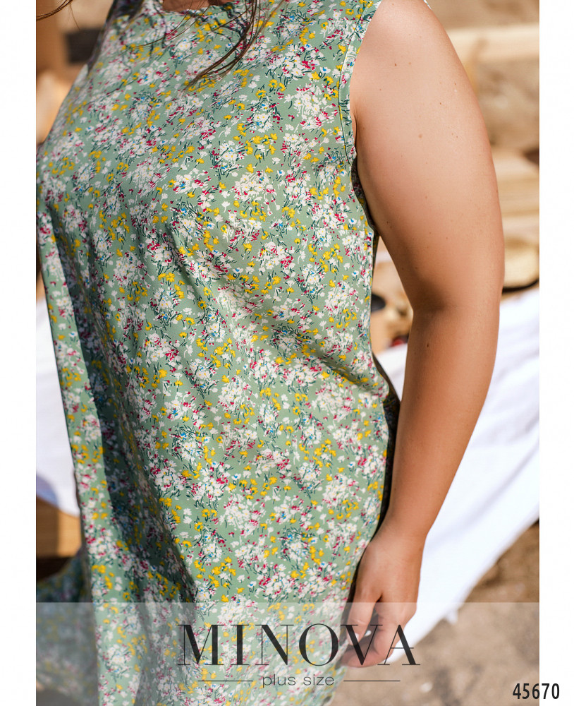 Стильное платье плюс сайз с полукруглым вырезом горловины, застёжка - пуговка сзади под шеей, без рукавов, на груди вытачки, на подоле оборки. Без карманов. Пояс НЕ входит в комплект.