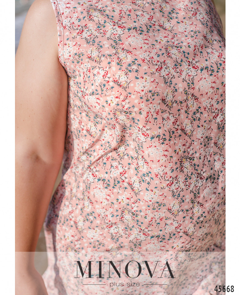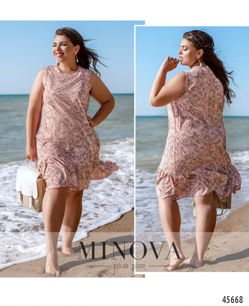 Стильное платье плюс сайз с полукруглым вырезом горловины, застёжка - пуговка сзади под шеей, без рукавов, на груди вытачки, на подоле оборки. Без карманов. Пояс НЕ входит в комплект.