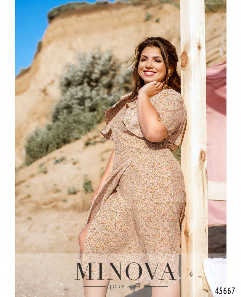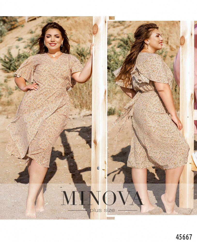Романтичное платье батал без декора, с рукавами-крылышками. Завязывается на запАх, поясок продевается в прорезь сбоку на талии. Карманов и застёжек нет, подкладки нет. На груди вытачки.