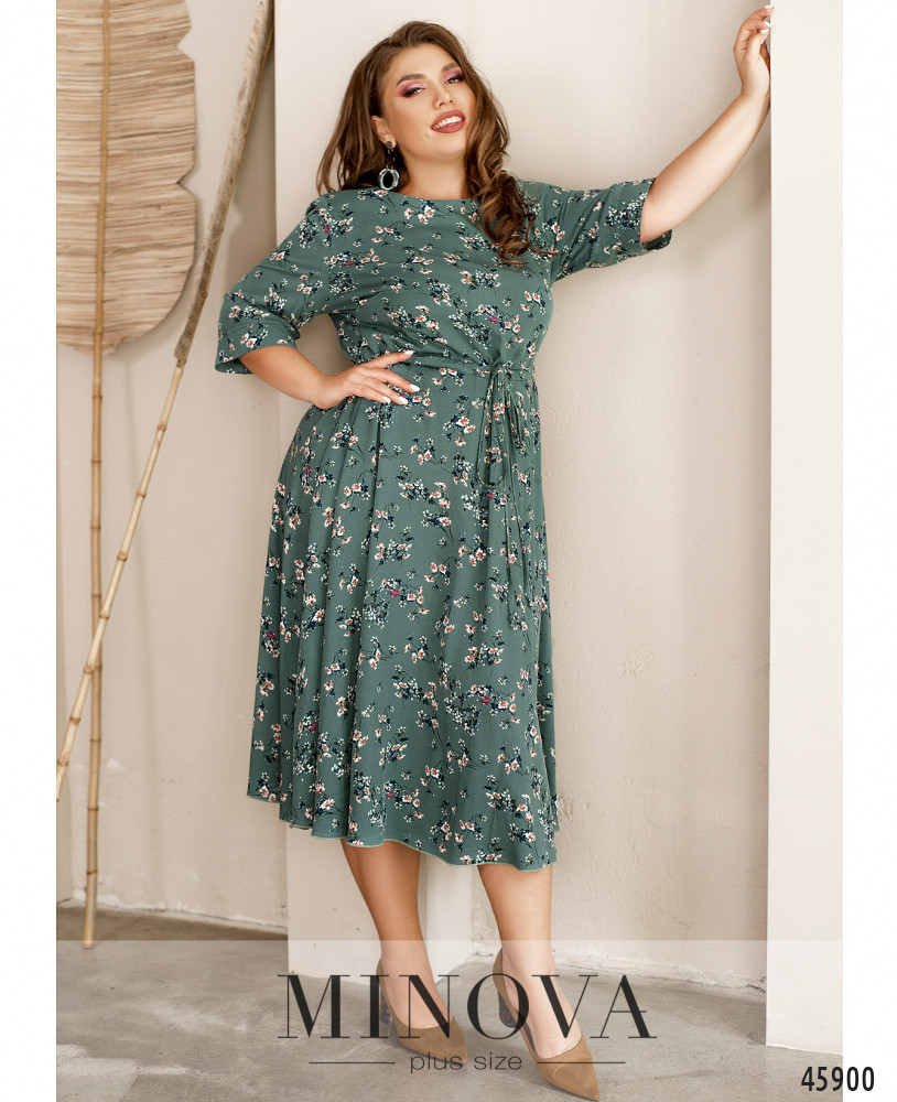Стильное платье большого размера с коротким рукавом, без застёжек и карманов, с широким полукруглым вырезом горловины. Через талию пропущен шнурок под кулиской, подол ниспадает мягкими оборками.