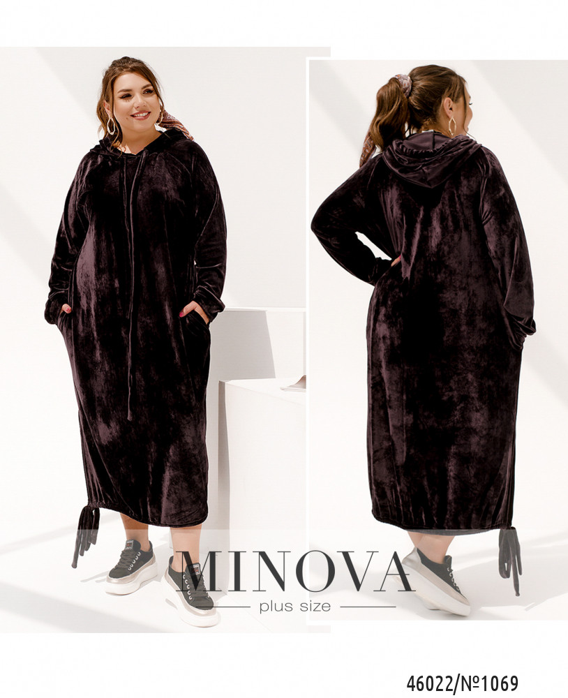 Мягкое платье батал без застёжек, по бокам - врезные карманы, в наличии капюшон с пропущенным через него шнурком. Рукава с мягкими манжетами без пуговиц. Через подол снизу пропущен шнурок, который завязывается сбоку, затягивая длинный разрез.