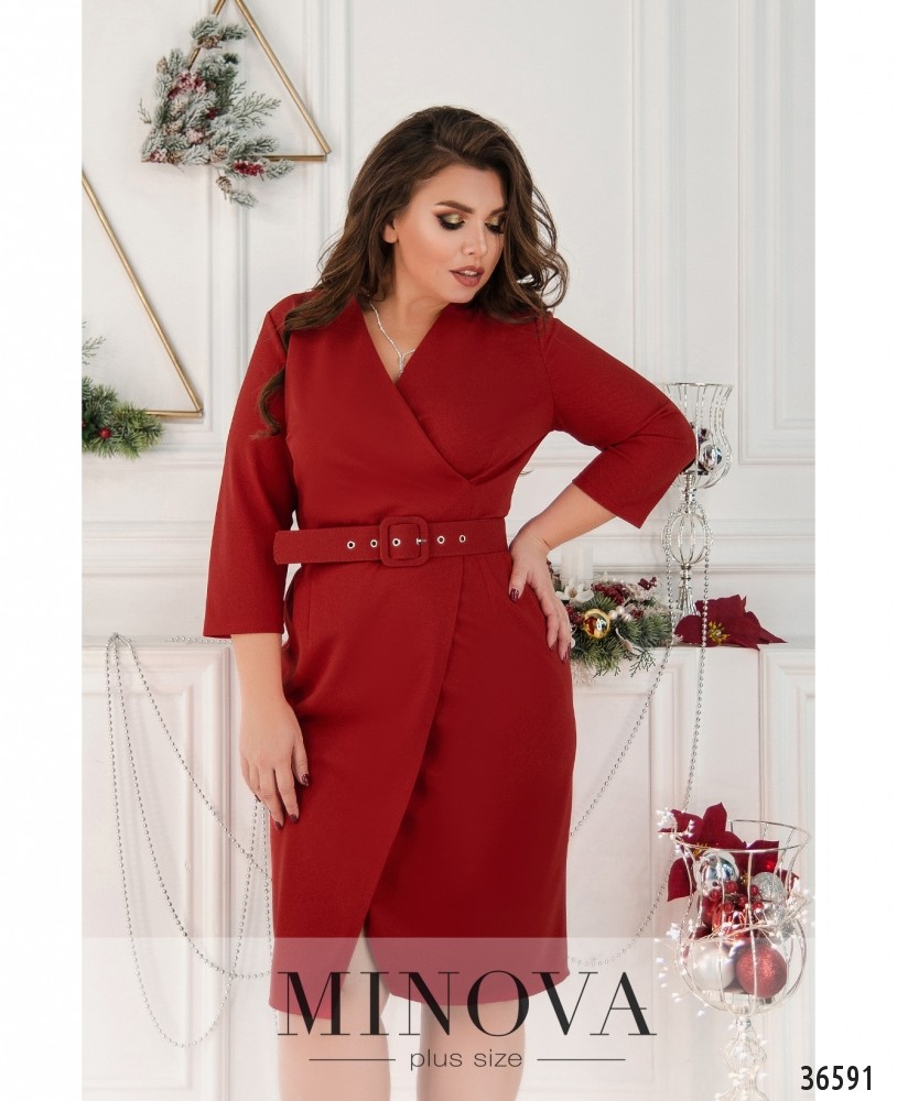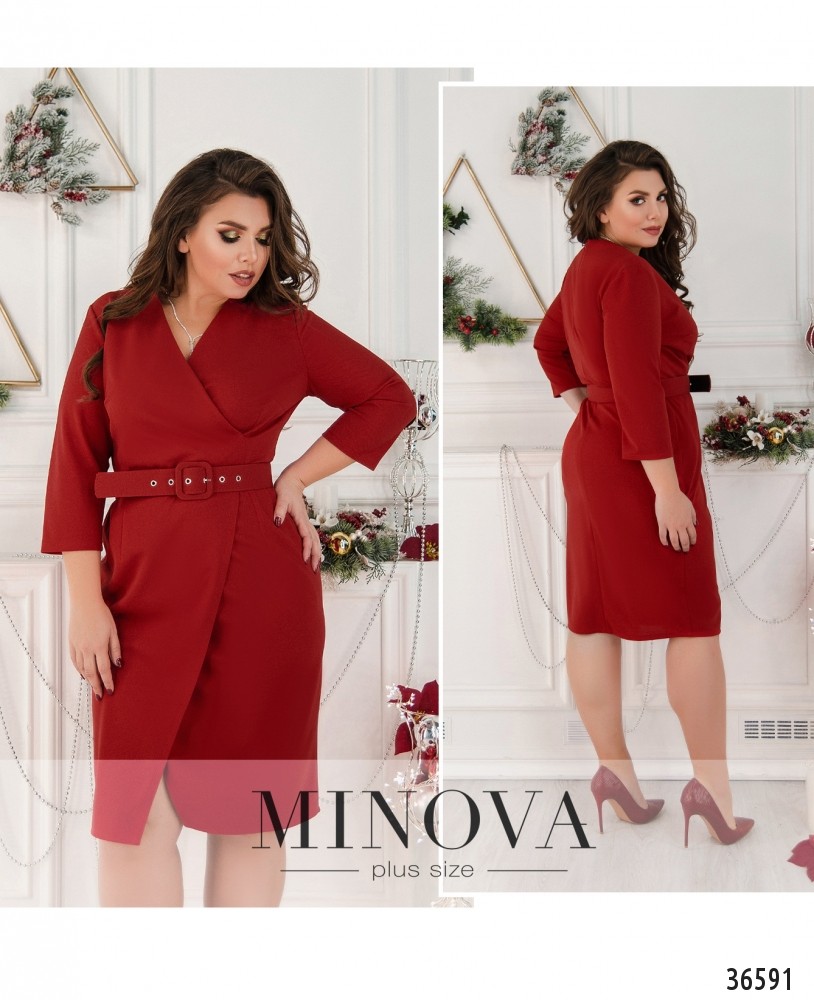 Ищешь что-то понаряднее для своего повседневного гардероба? Minova представляет в новом каталоге платьев плюс сайз модель платья батал из мягкой, приятной ткани. Платье на запАх, запАх подшит к талии сверху и снизу. Декольте не слишком глубокое. На груди небольшие вытачки – поперечные и продольные, так что ткань хорошо сидит на груди, карманов нет. Рукава длиной ¾, без манжет. Застёжка – вшитая по спинке змейка. Длина платья миди. В комплекте прилагается пояс в тон, который подчеркнёт приталенность силуэта. Прекрасный вариант для работы или для свидания.