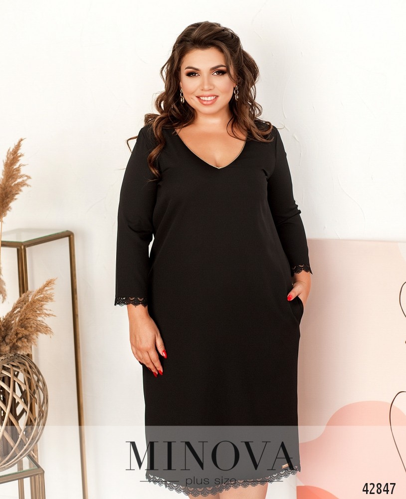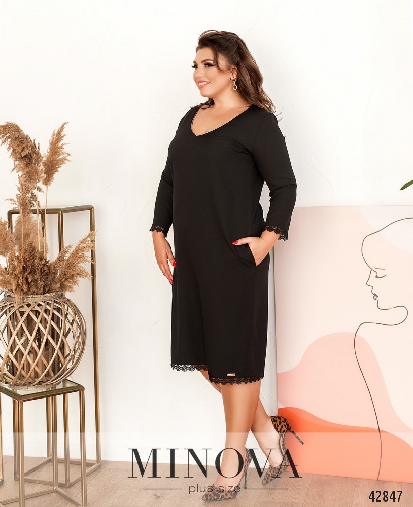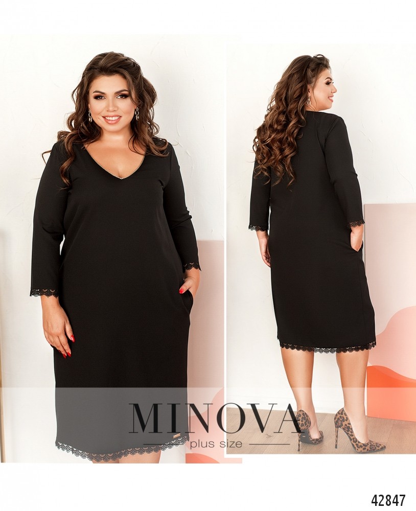 Элегантное платье батал для деловых встреч или вечернего образа. Вырез горловины V-образный, оторочен контрастной окантовкой. Рукава и подол украшены тонким кружевом. Изнутри ткань гладкая. Застёжек нет.